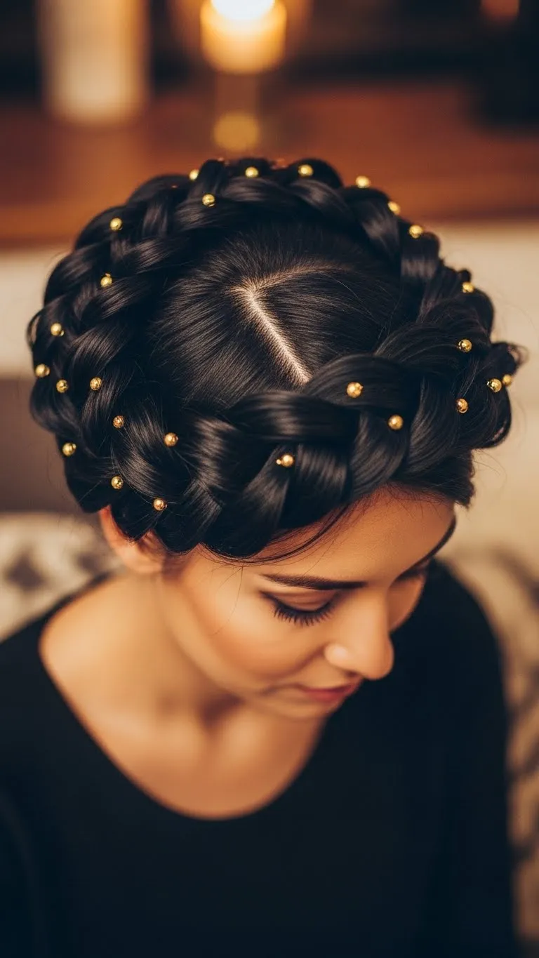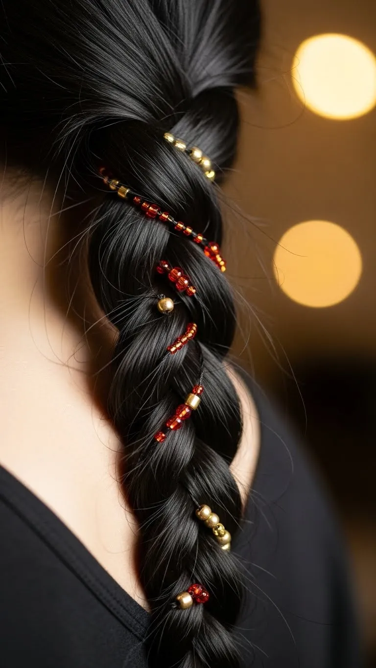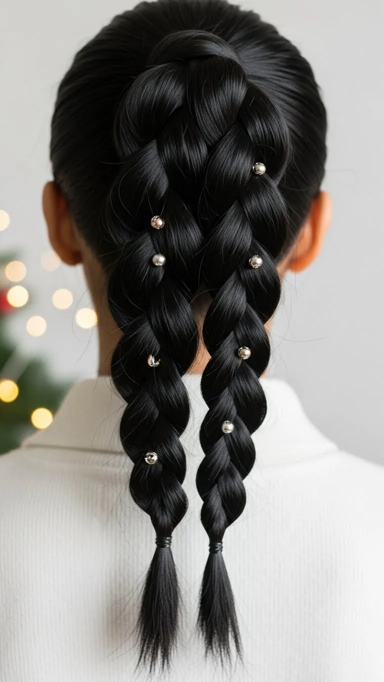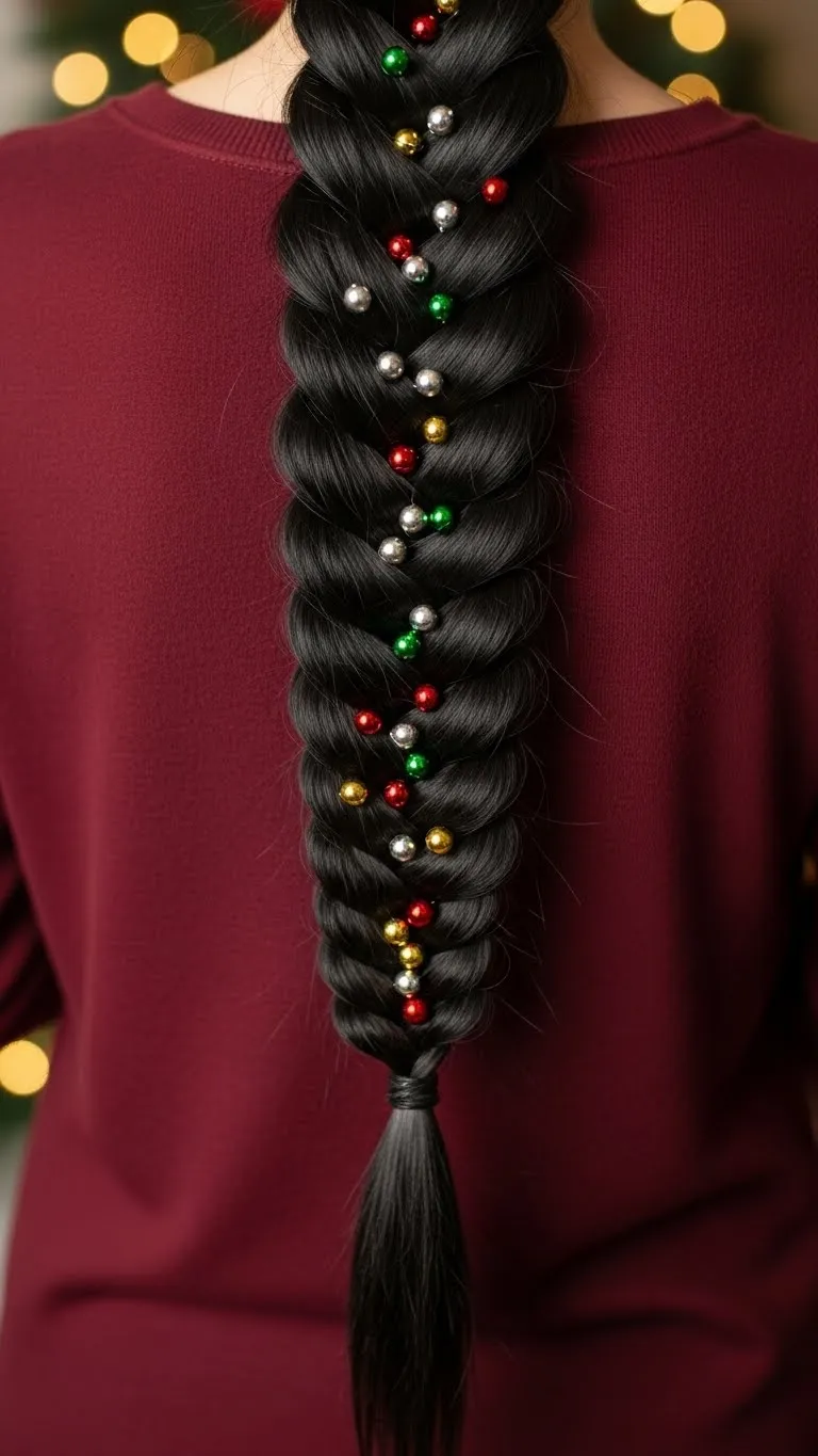 Rope braids add texture and shine. Twist two sections tightly for a rope effect, secure into a ponytail, and add beads. Easy at home, works for medium to long hair. Keeps hair neat and adds subtle sparkle. Great for holiday dinners or festive shopping trips.