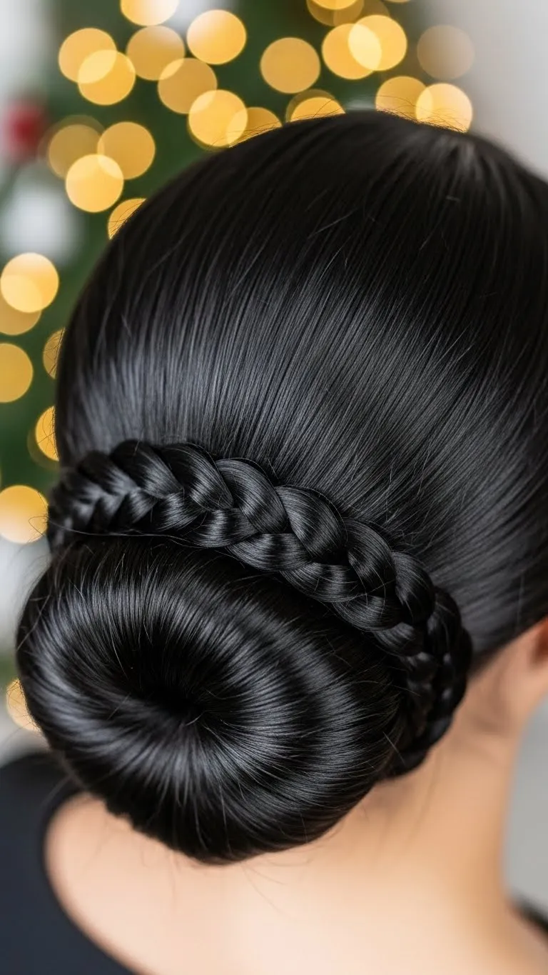 Low chignons with braids look elegant and manageable. Create small braids, gather into a low bun, and secure. Add tiny festive pins or beads. Budget-friendly and simple to DIY. Great for formal dinners or casual family events. Medium-length hair works best. Apply light shine serum to keep it glossy. It’s protective and stylish at the same time.