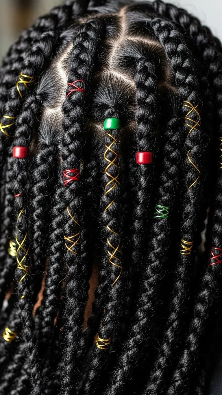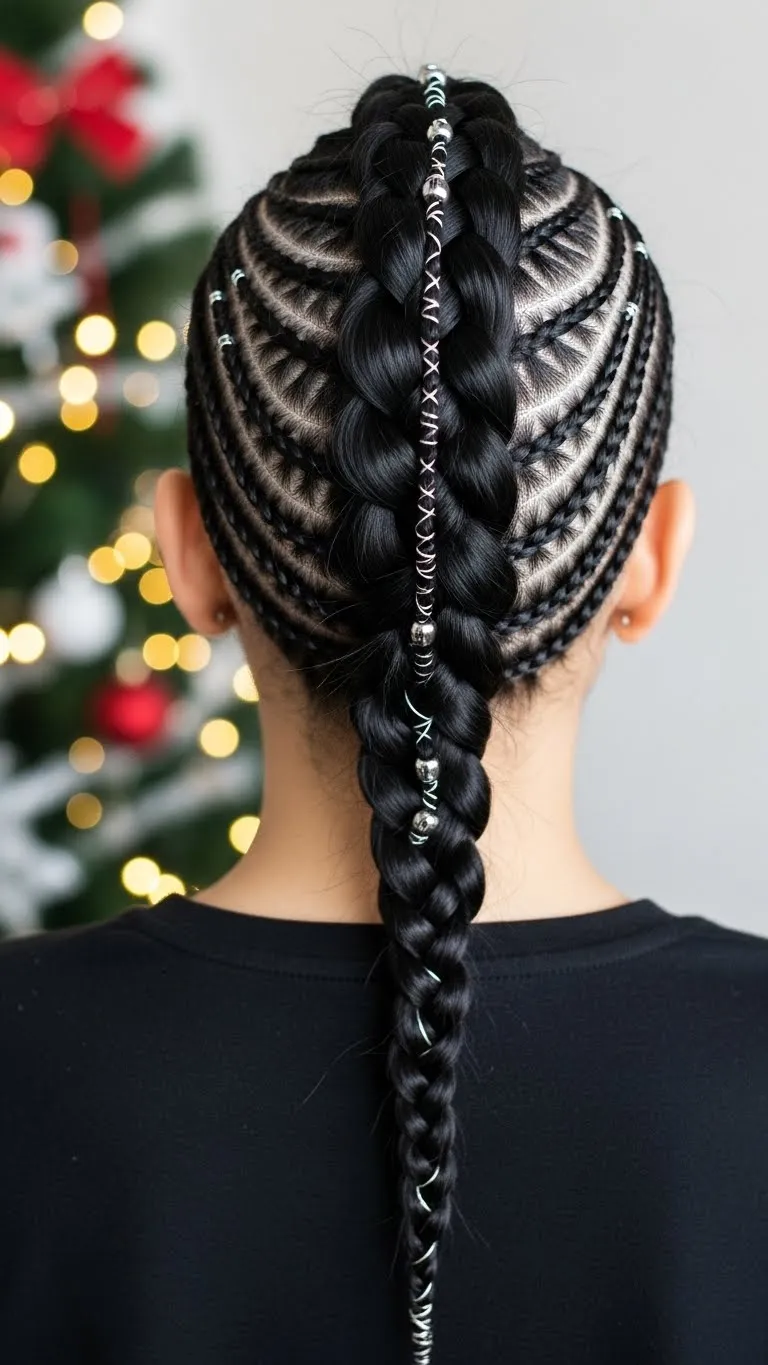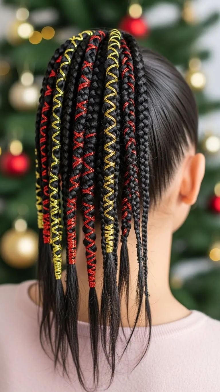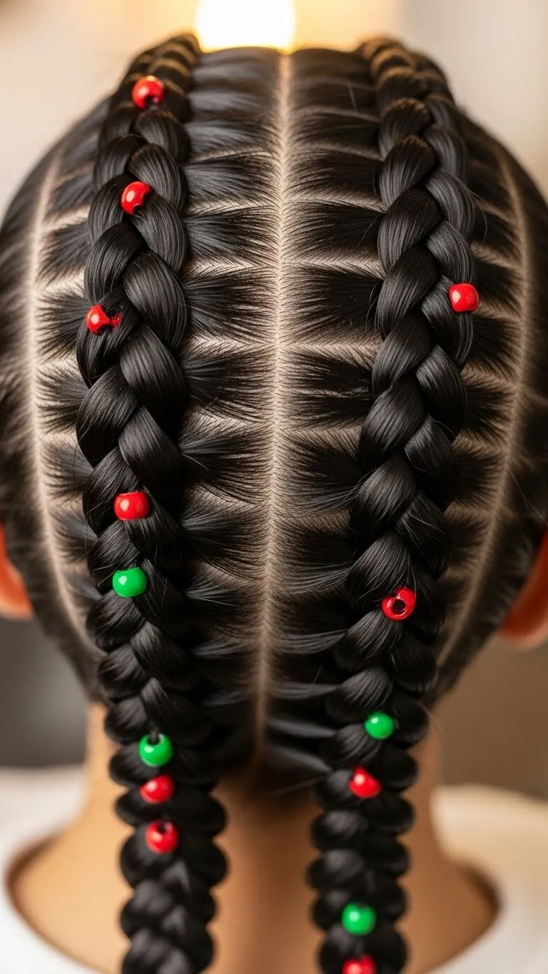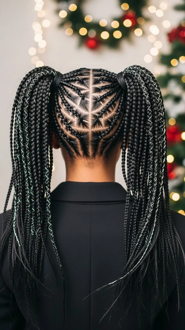 Pigtails get a festive upgrade with glitter threads. Cornrow each side tightly and let the braids hang. Adding shiny threads or beads instantly makes them holiday-ready. This style is playful, great for kids or teens, and inexpensive. A bit of edge control and a comb is enough. You can even mix and match thread colors for more Christmas cheer. Easy to remove after parties too.