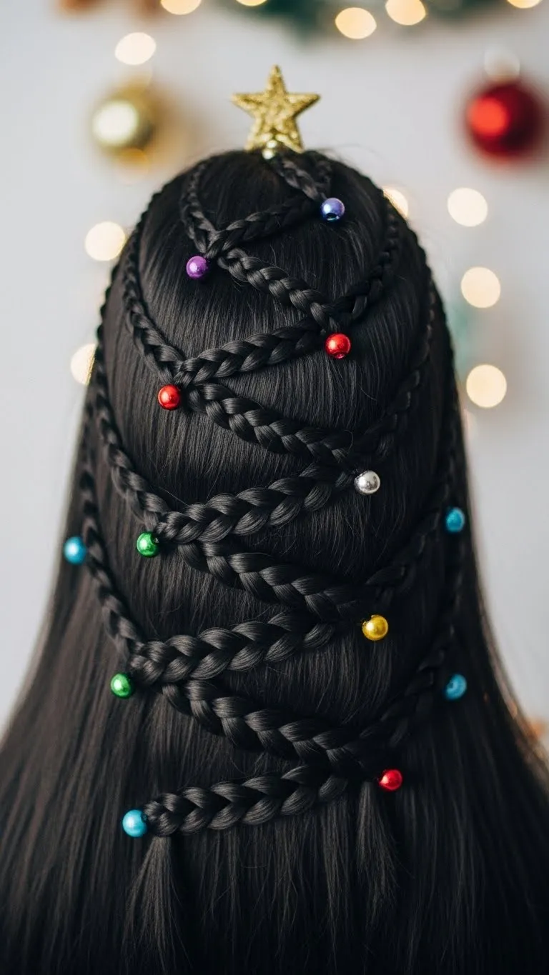 Create Christmas tree braids by stacking small braids vertically. Add beads as ornaments. Fun DIY idea that works for medium to long hair. No salon needed—just section hair and braid. Eye-catching for parties and holiday photos. Simple, creative, and festive without spending a lot.