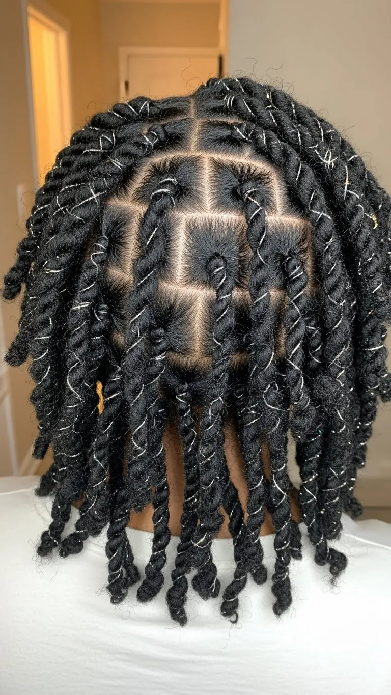 Medium twists are easy to do at home. Add glitter threads to each twist for sparkle. Works for medium-length natural hair. Protective and stylish at the same time. Quick to achieve in 30-40 minutes. Ideal for holiday casual wear. No fancy products needed—just hair gel and threads.