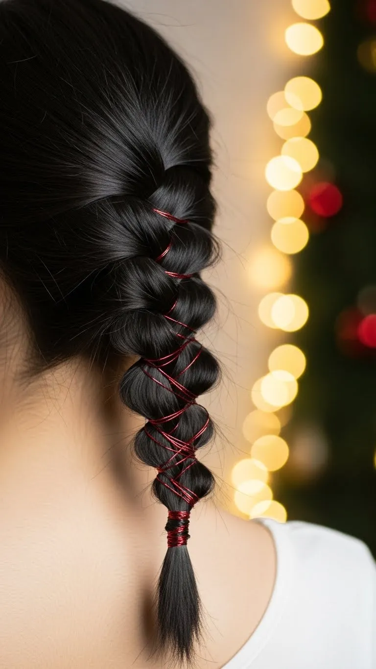 This playful ponytail is simple yet striking. Braid your hair into small sections and tie them into a high ponytail. Wrap glitter thread or metallic string around each braid. The look works on medium and long hair and is easy to recreate at home. Apply light mousse to avoid flyaways. This hairstyle is perfect for last-minute holiday photos or casual festive outings.
