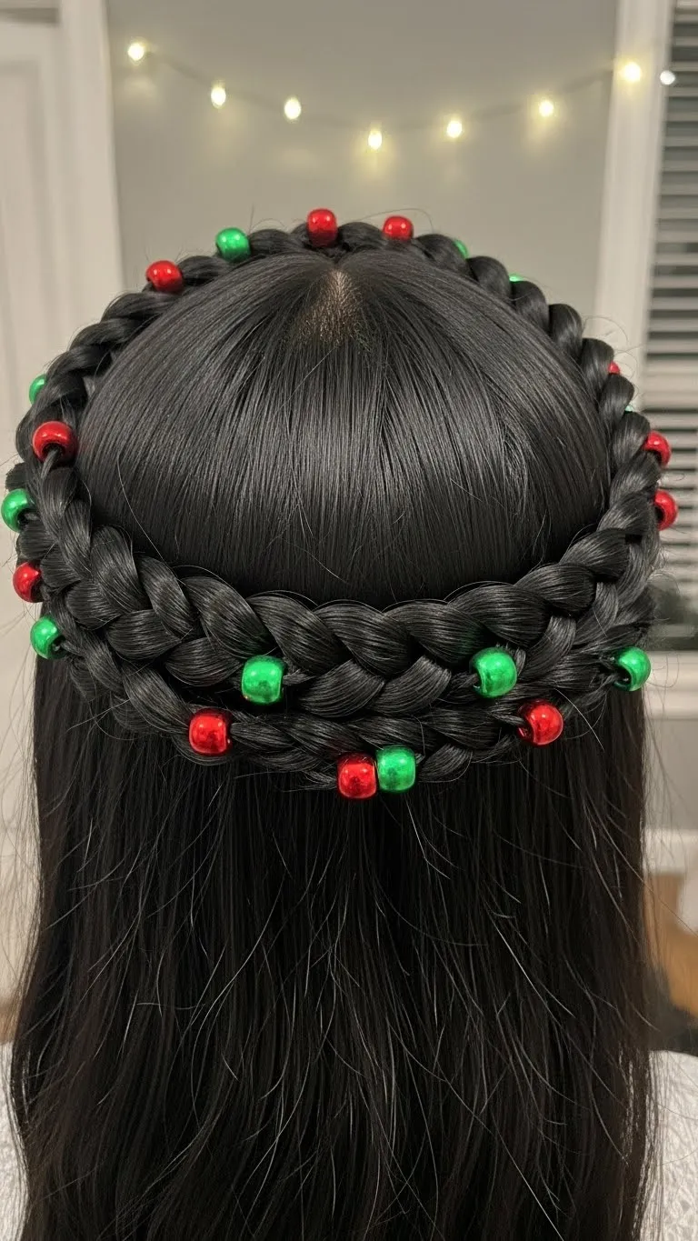 Braid around the head like a crown and attach red and green beads. DIY-friendly and elegant. Works for medium-length hair. Stays neat all day, great for parties and family gatherings. Adds festive charm and protects hair at the same time.