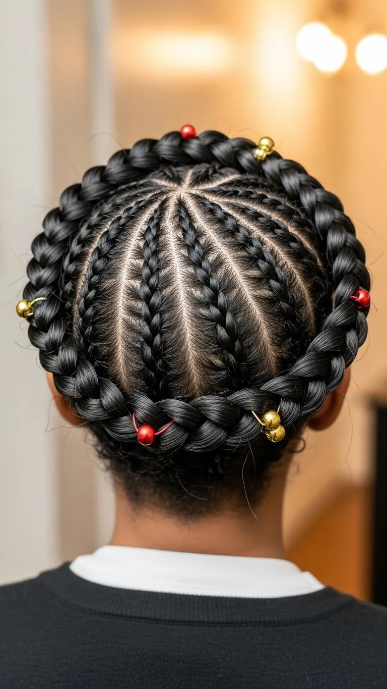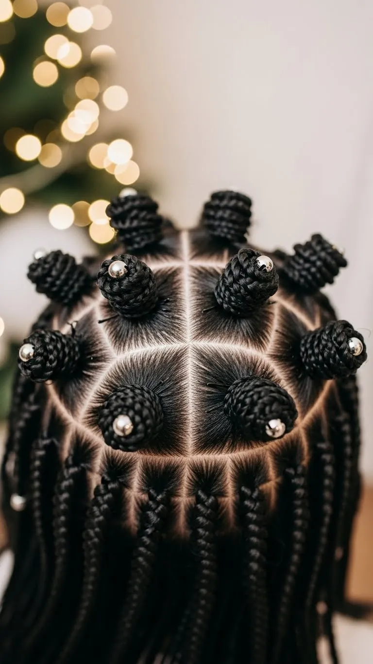 Cornrow crowns give a regal and neat appearance. You can decorate the rows with thin colorful threads or tiny bells for a holiday twist. These braids protect your hair while letting your natural shine show. They are budget-friendly, needing only a comb, edge control, and small hair ties. The style works well for short or medium hair, and you can create a DIY version with online tutorials. It’s perfect for holiday parties or cozy gatherings.