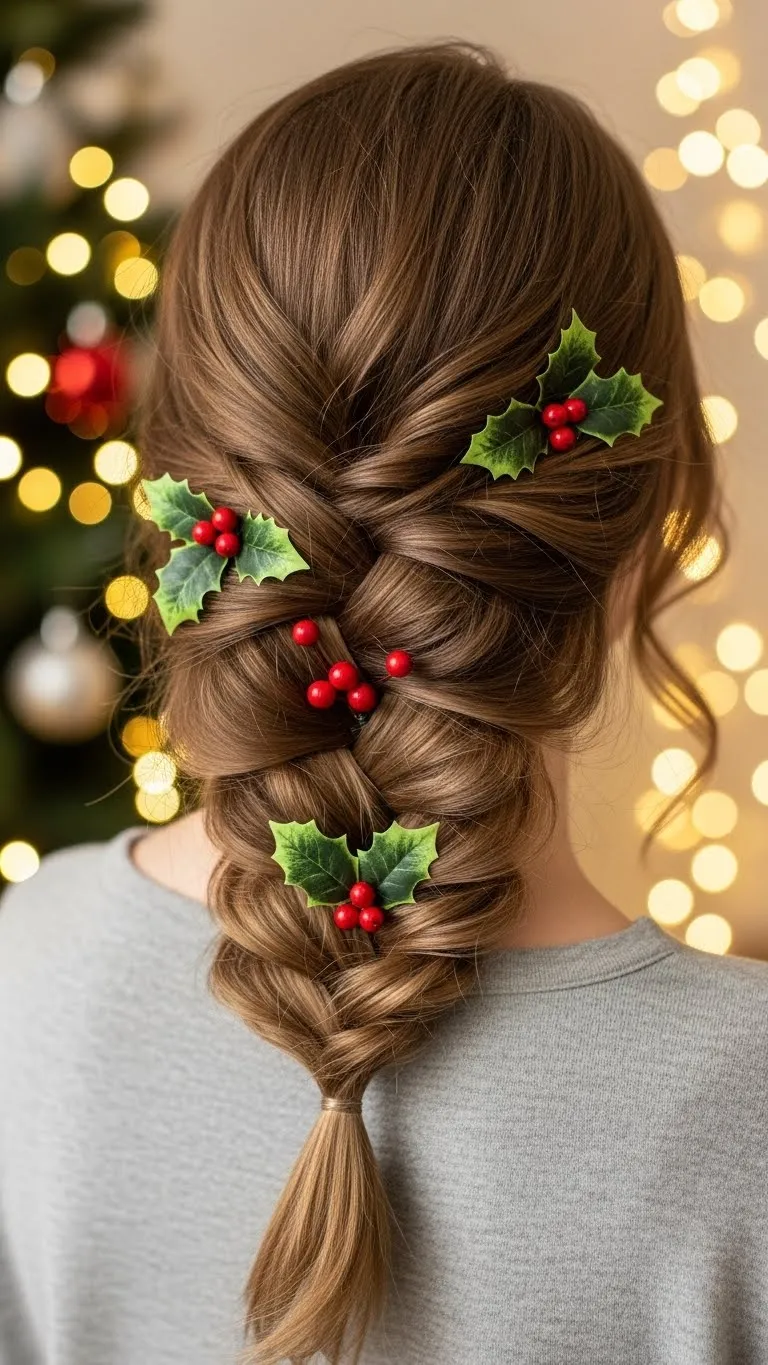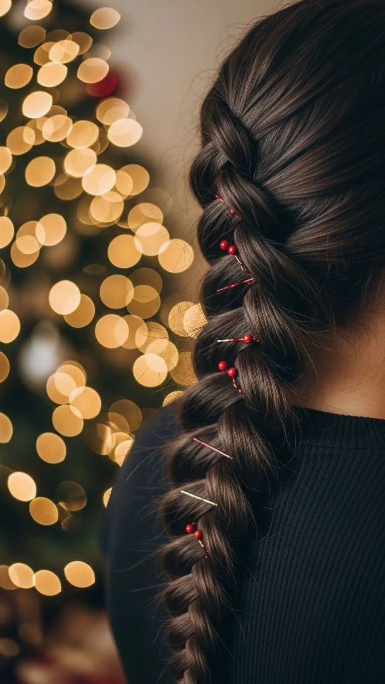 A fishtail braid adds depth and detail without extra tools. Divide hair into two sections and weave small strands alternately. Weave a thin red or gold ribbon along the braid for a festive twist. Fishtails look complex but are manageable if you work slowly. For extra volume, pull gently at braid edges once finished. This style pairs well with simple earrings and a cozy sweater. Tip: practice on damp hair to prevent flyaways and keep strands smooth without gels or sprays.