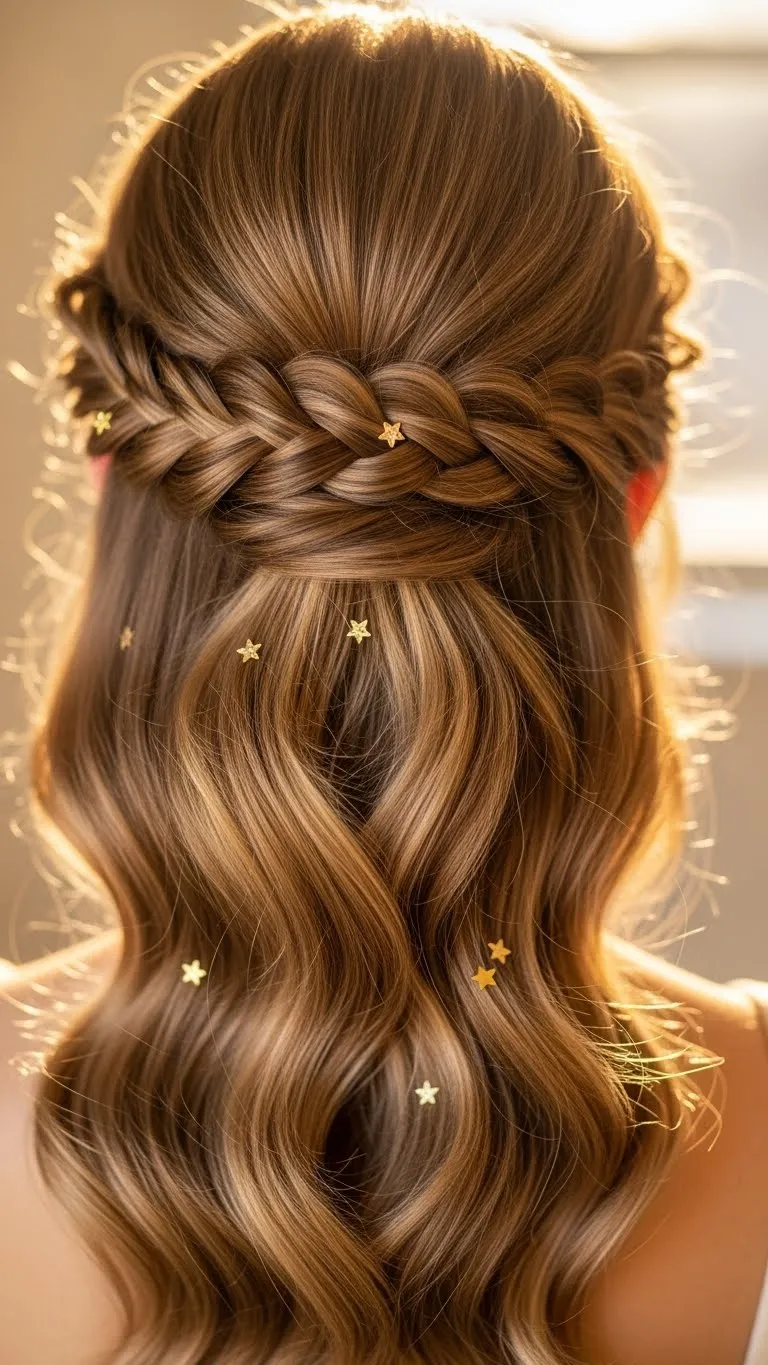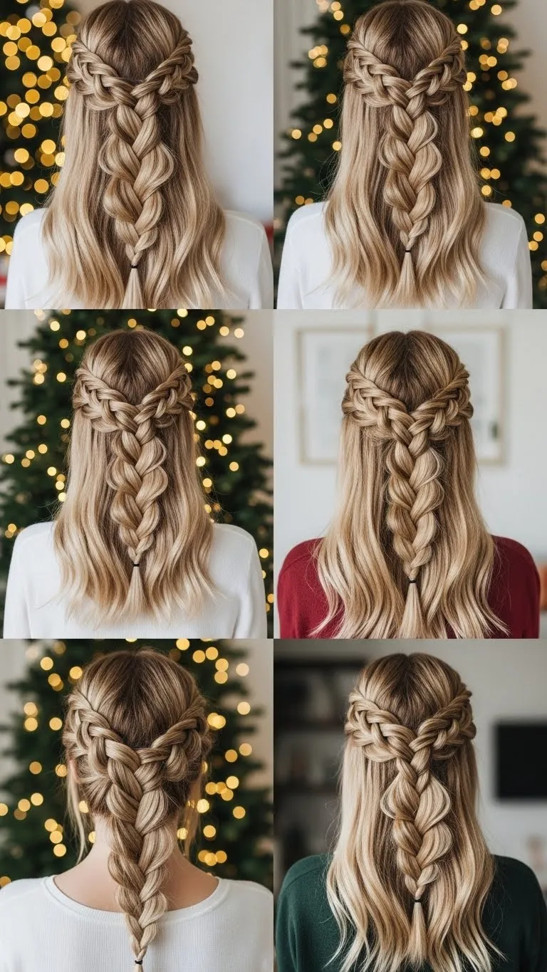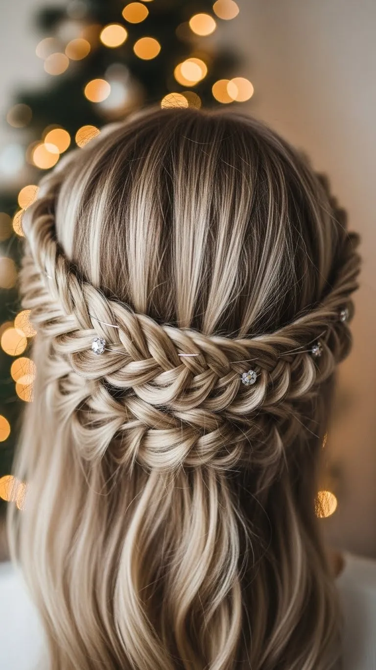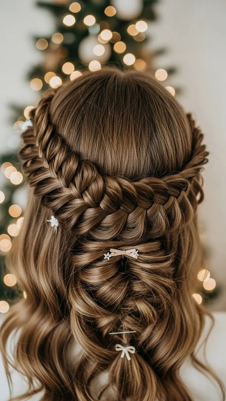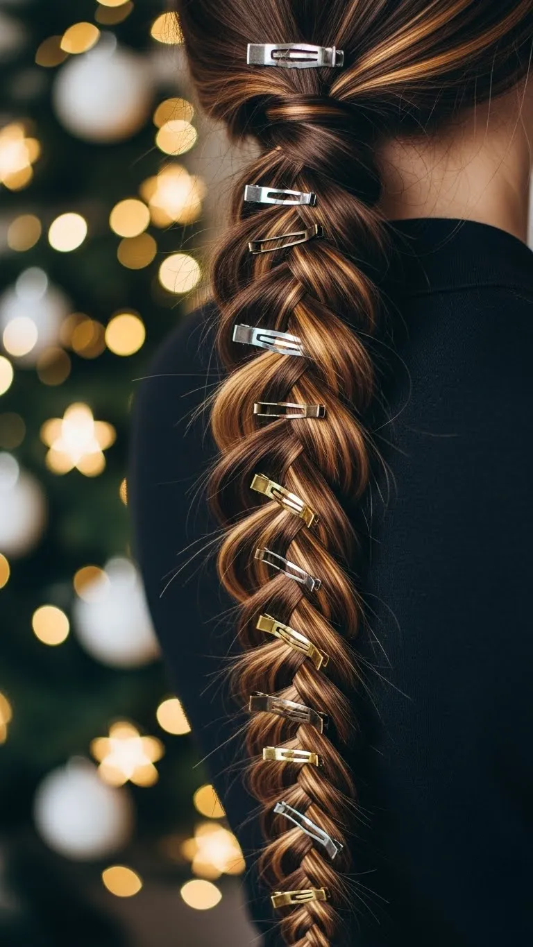 Twisted halo fishtails combine elegance and festive charm. Braid around your head, incorporating twists and small decorative pins. Works on long hair and adds sparkle to any holiday outfit. Budget-friendly: DIY stars or glitter from craft supplies.