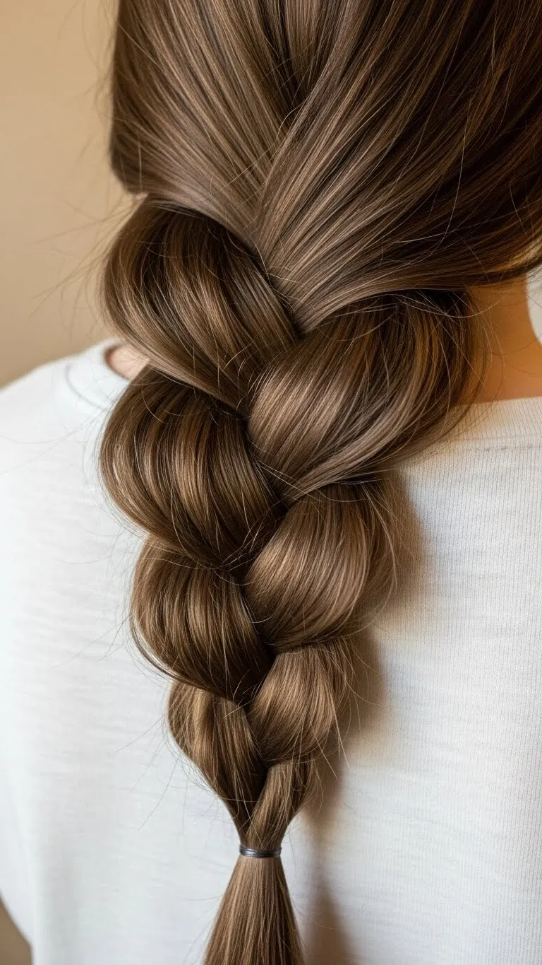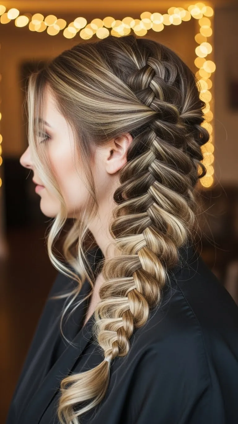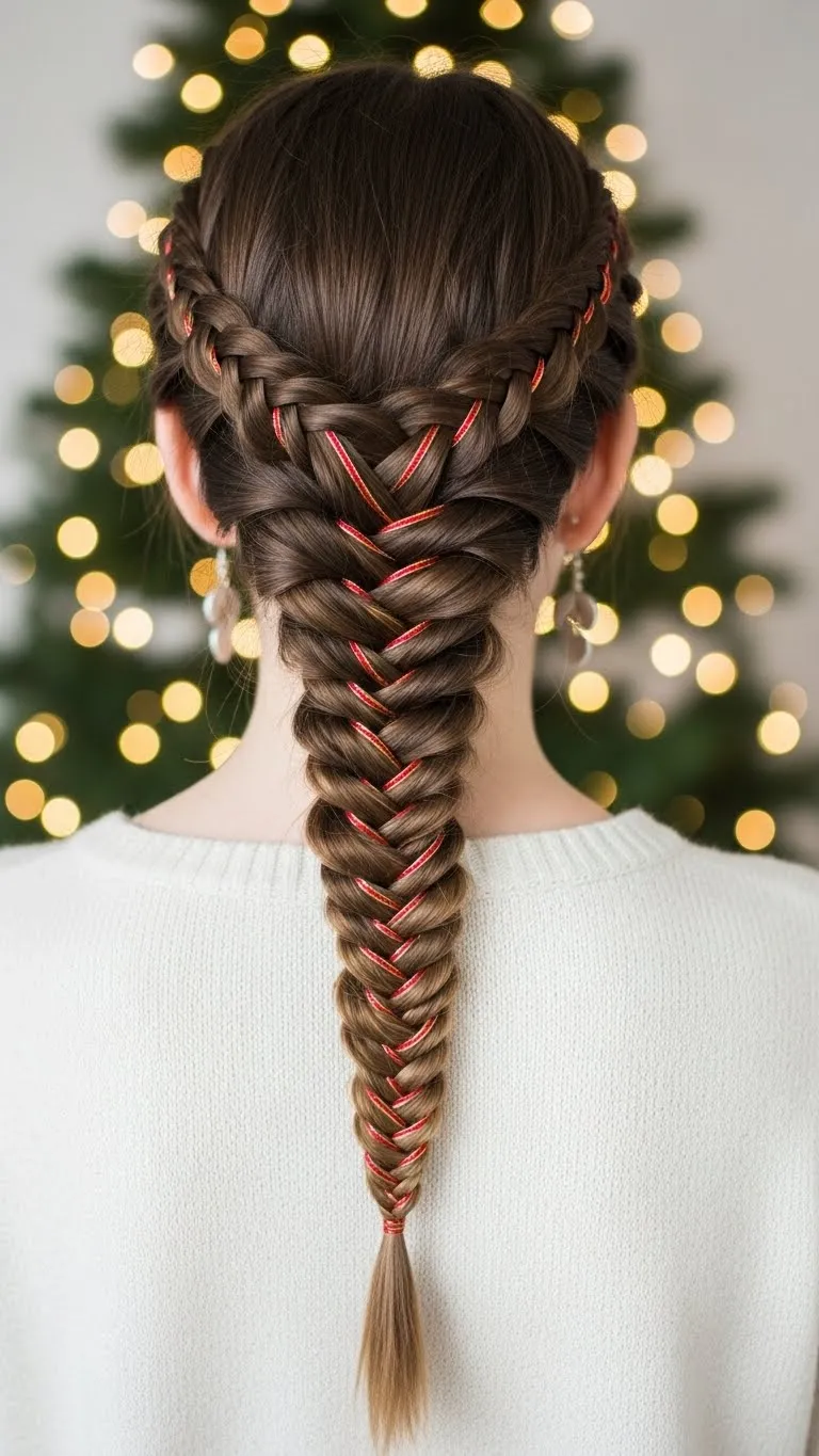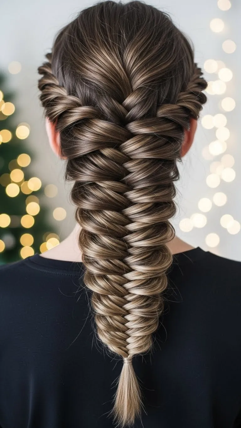 Twist sections before weaving into a fishtail braid for fuller texture. Add tiny clips or beads for Christmas cheer. Works well for long hair. Quick DIY: pull braid gently for volume.