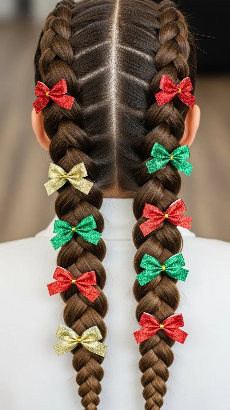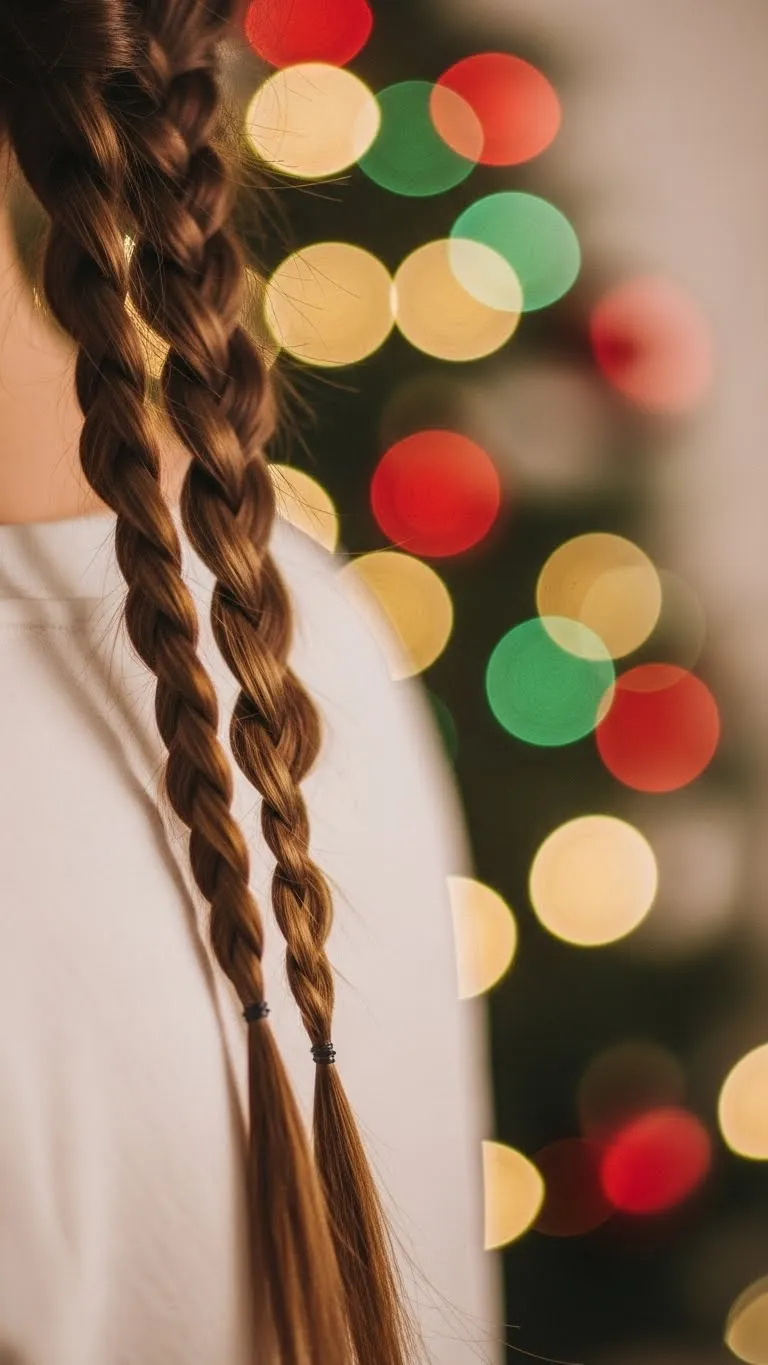 Double braids are playful and youthful. Split hair down the middle, then braid each side. Add festive hair clips or glitter spray for extra charm. Pigtails work for short or long hair, making them versatile for holiday events. Keep it relaxed by loosening sections slightly or tighten for a polished look. They’re easy to maintain through the evening and prevent hair from tangling. Budget-friendly tip: reuse ribbons or clips from last year for decoration.