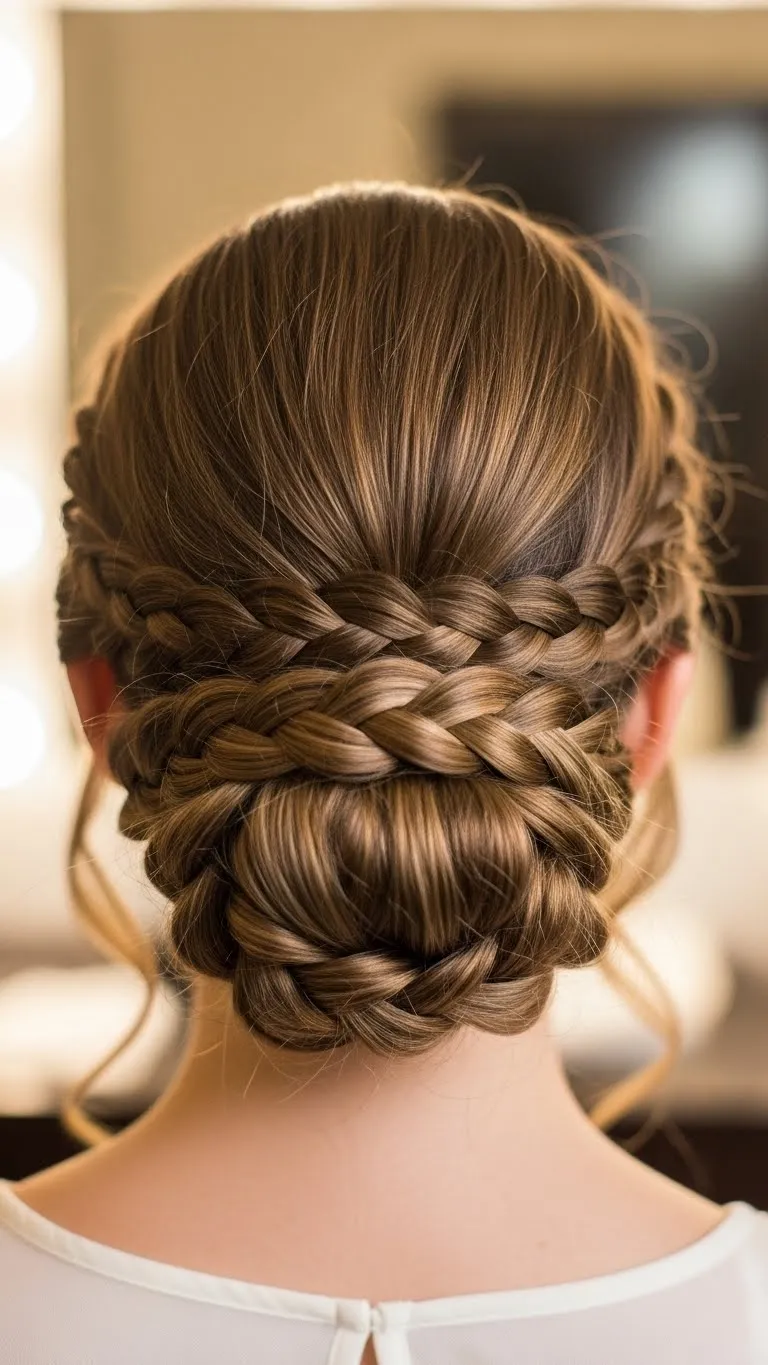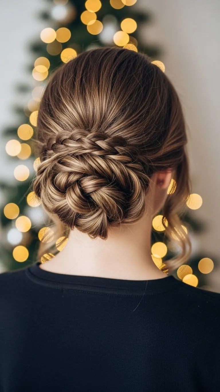 A braided twisted bun looks sophisticated. Braid a few strands, twist them together, and pin into a bun. Perfect for dinners or parties. Add sparkling pins to make it festive. Quick DIY: a sock or elastic can make the bun look fuller.