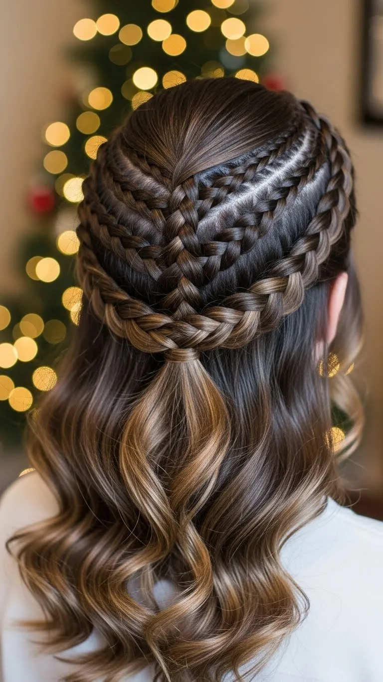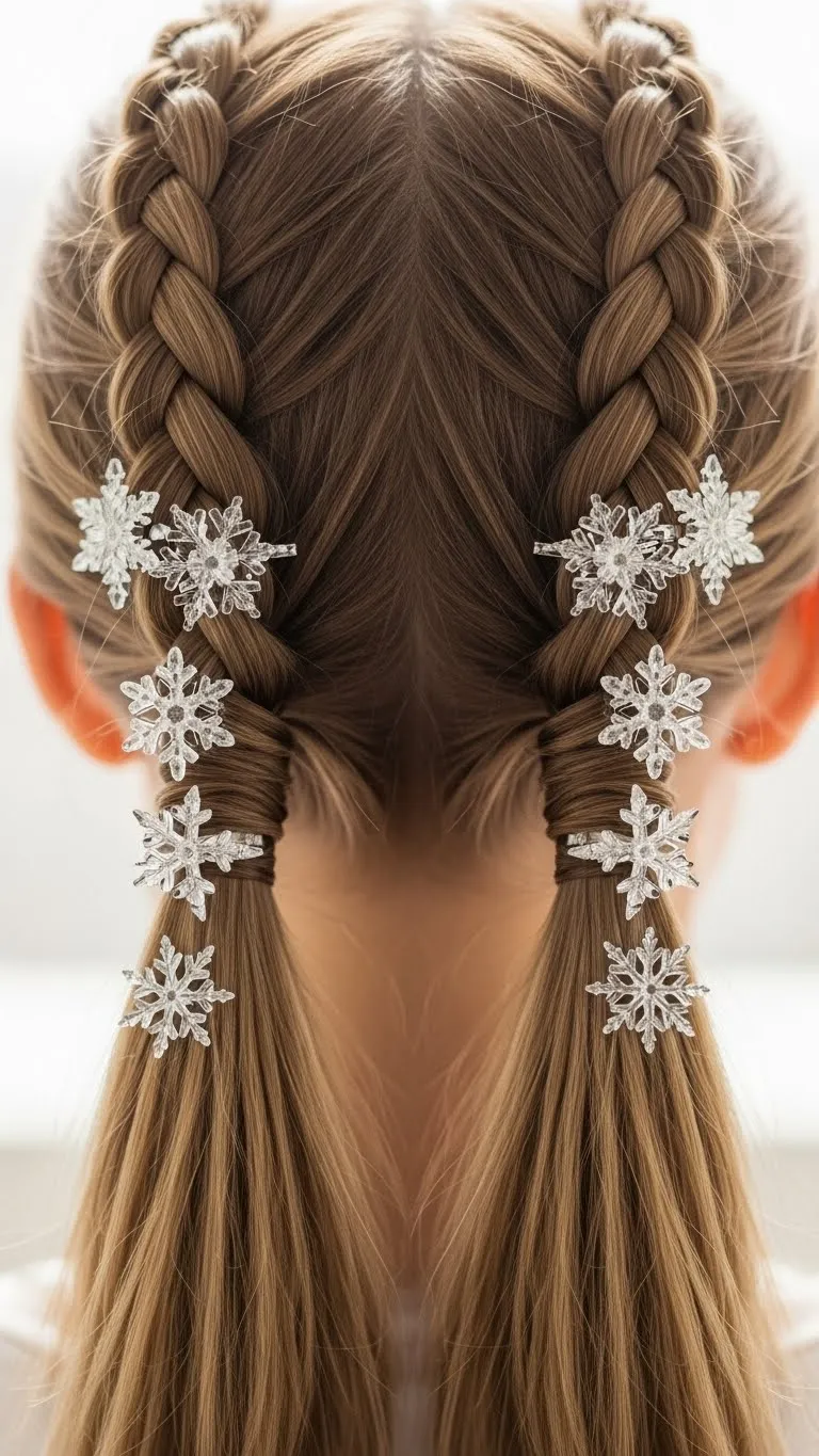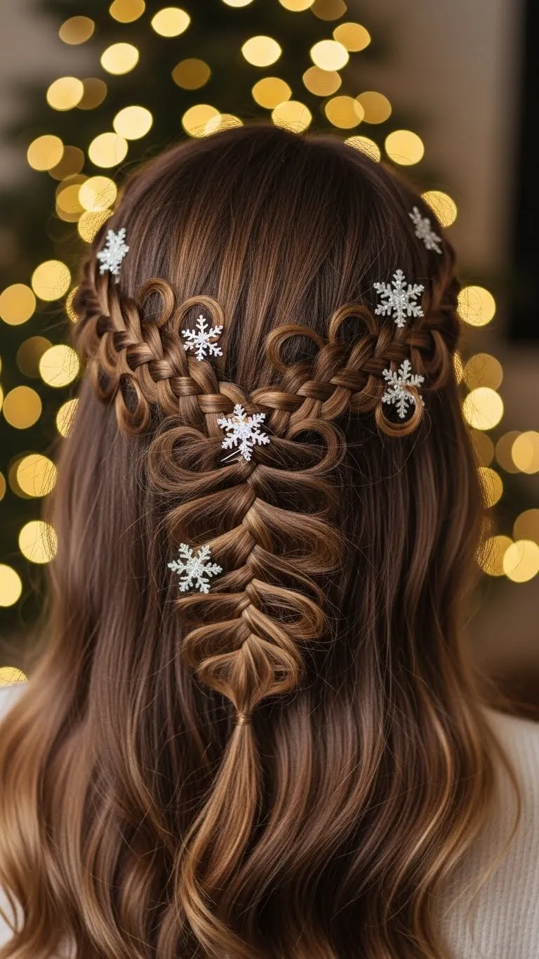 Snowflake braids capture the holiday spirit. Twist sections and loop creatively to mimic snowflakes. Add small snowflake pins or beads. Works best on long hair and looks magical in photos. DIY: use beads or craft snowflakes for decoration.