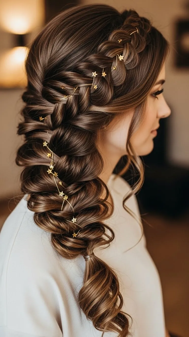 Side rope braids with curls are casual yet elegant. Twist two sections and let hair flow over your shoulder. Curl remaining hair lightly for volume. Add mini stars or ribbons for holiday sparkle. Budget-friendly: reuse old pins or ribbons.