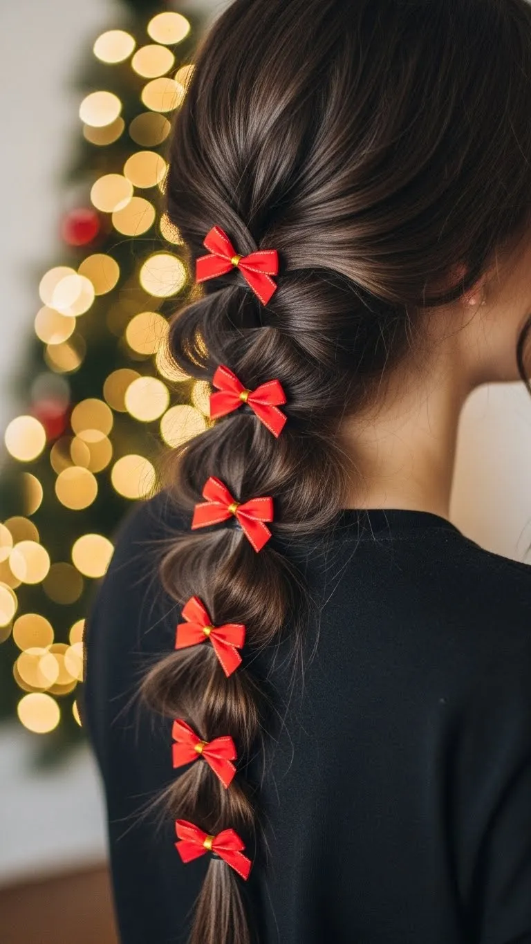 Side waterfall braids with bows are charming. Braid loosely and attach small bows along the cascade. Works for medium to long hair. Quick DIY: use leftover holiday ribbon.