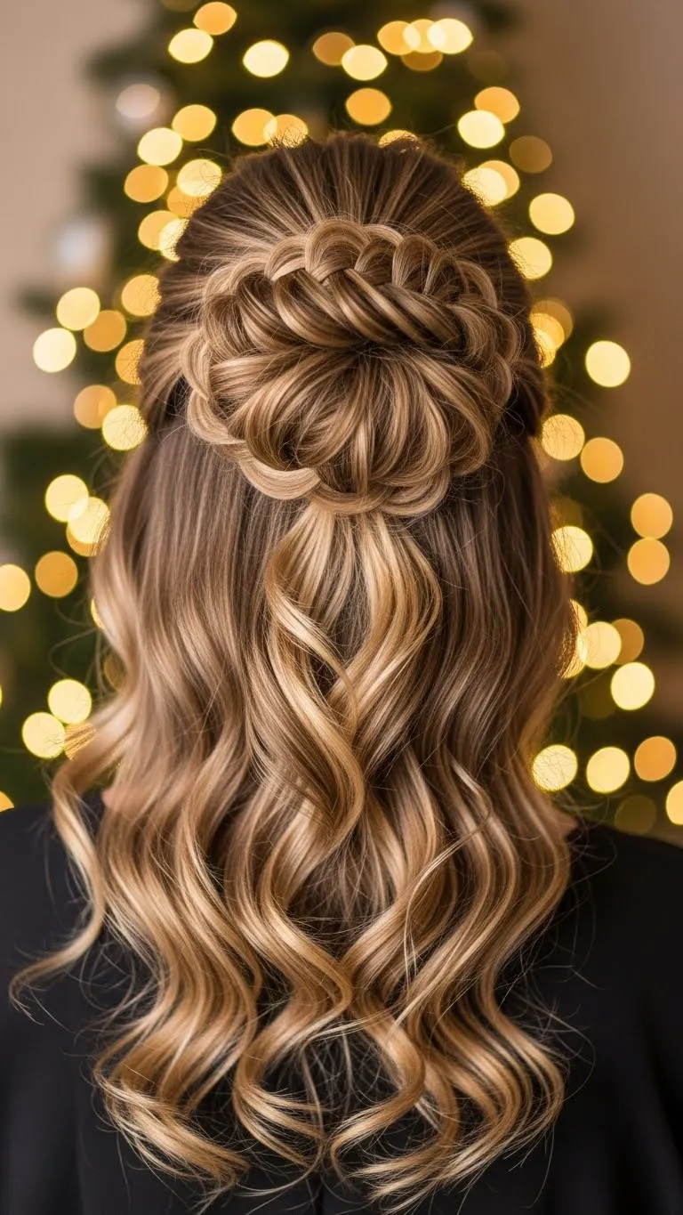 A half-up braided bun combines elegance with simplicity. Braid the top half of your hair and twist it into a small bun. The rest flows freely for a soft, romantic effect. Perfect for parties or family dinners. You can embellish with tiny festive pins or a hair comb. This style keeps hair out of your face and adds interest without needing extra accessories. Quick DIY tip: use a sock bun to make the bun fuller without buying extensions.