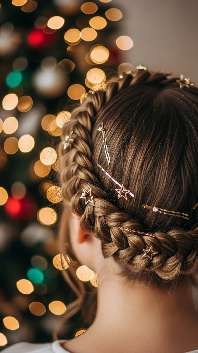 Halo braids look elegant and whimsical. Braid along the hairline around your head, tucking the ends underneath. Accessorize with miniature stars or tiny bells for holiday sparkle. This style works on medium to long hair and frames your face beautifully. Quick tip: spray lightly with hairspray to hold braid in place without stiffness. Budget-friendly twist: DIY small stars from foil or craft paper.