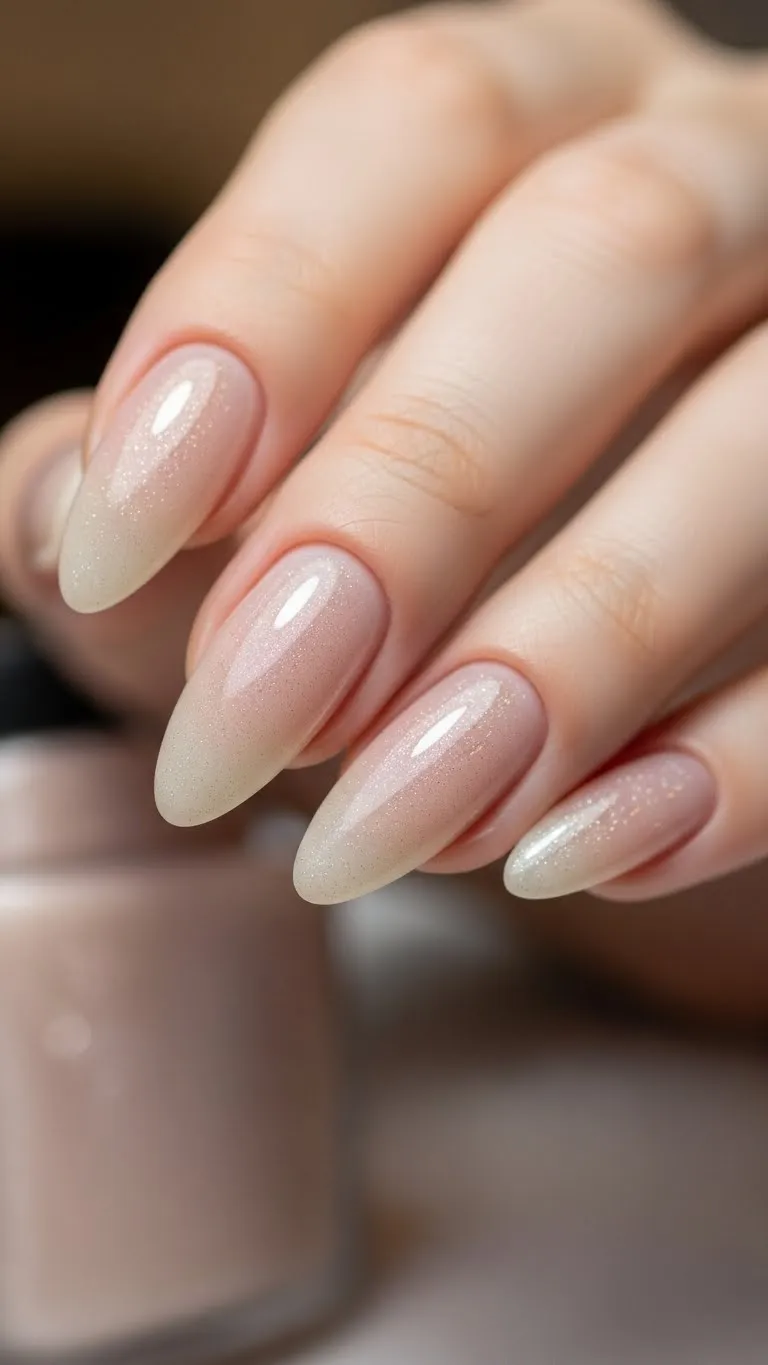 Shimmer nude nails add shine without being loud. Apply a nude base, then finish with a subtle shimmer topcoat. This simple glamour is perfect if you want polished nails that don’t steal the spotlight. Affordable shimmer polishes work on any nail shape. You can pair it with minimalistic rings or delicate accessories for a cohesive look. Perfect for low-key or upscale date nights.