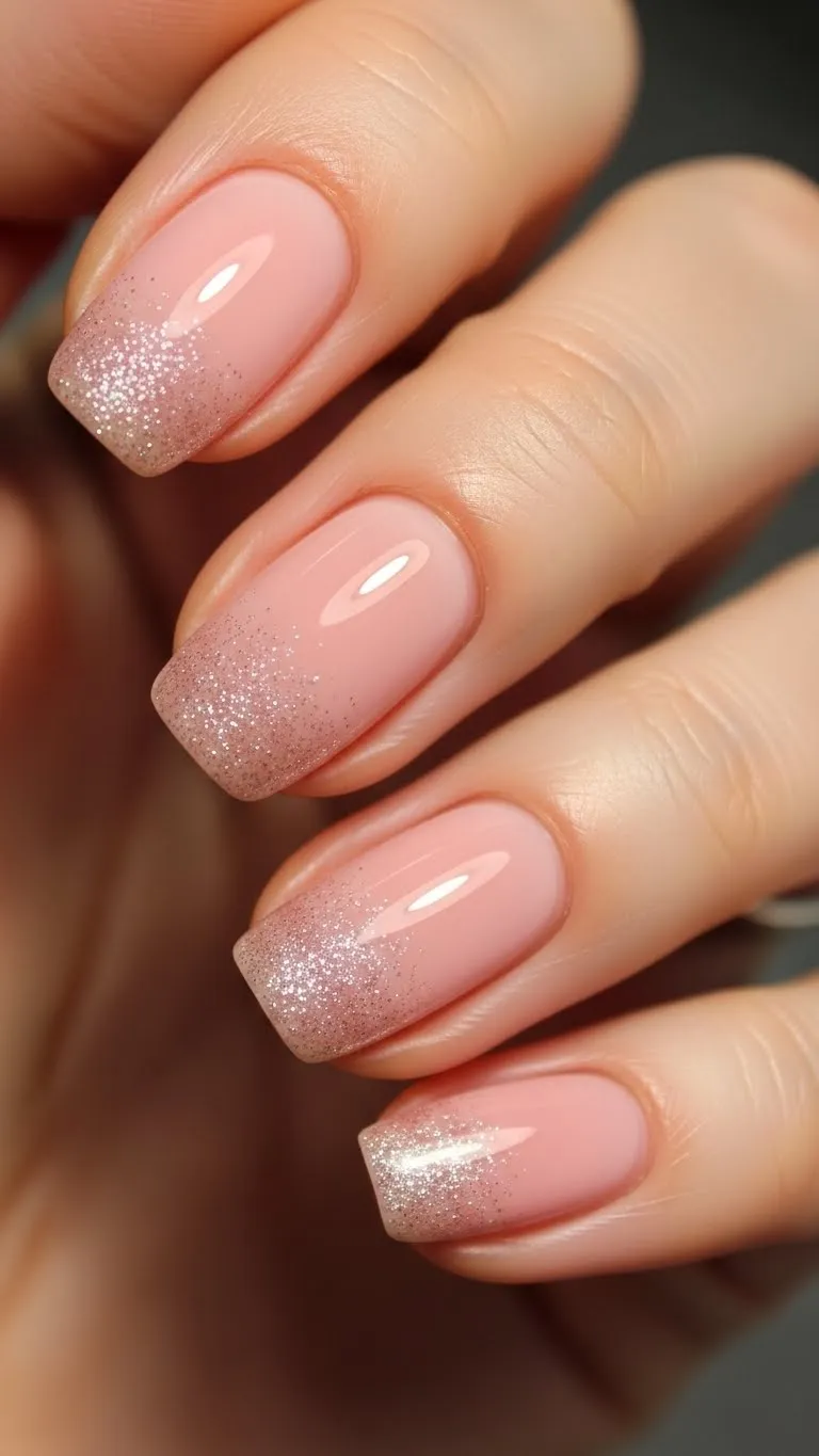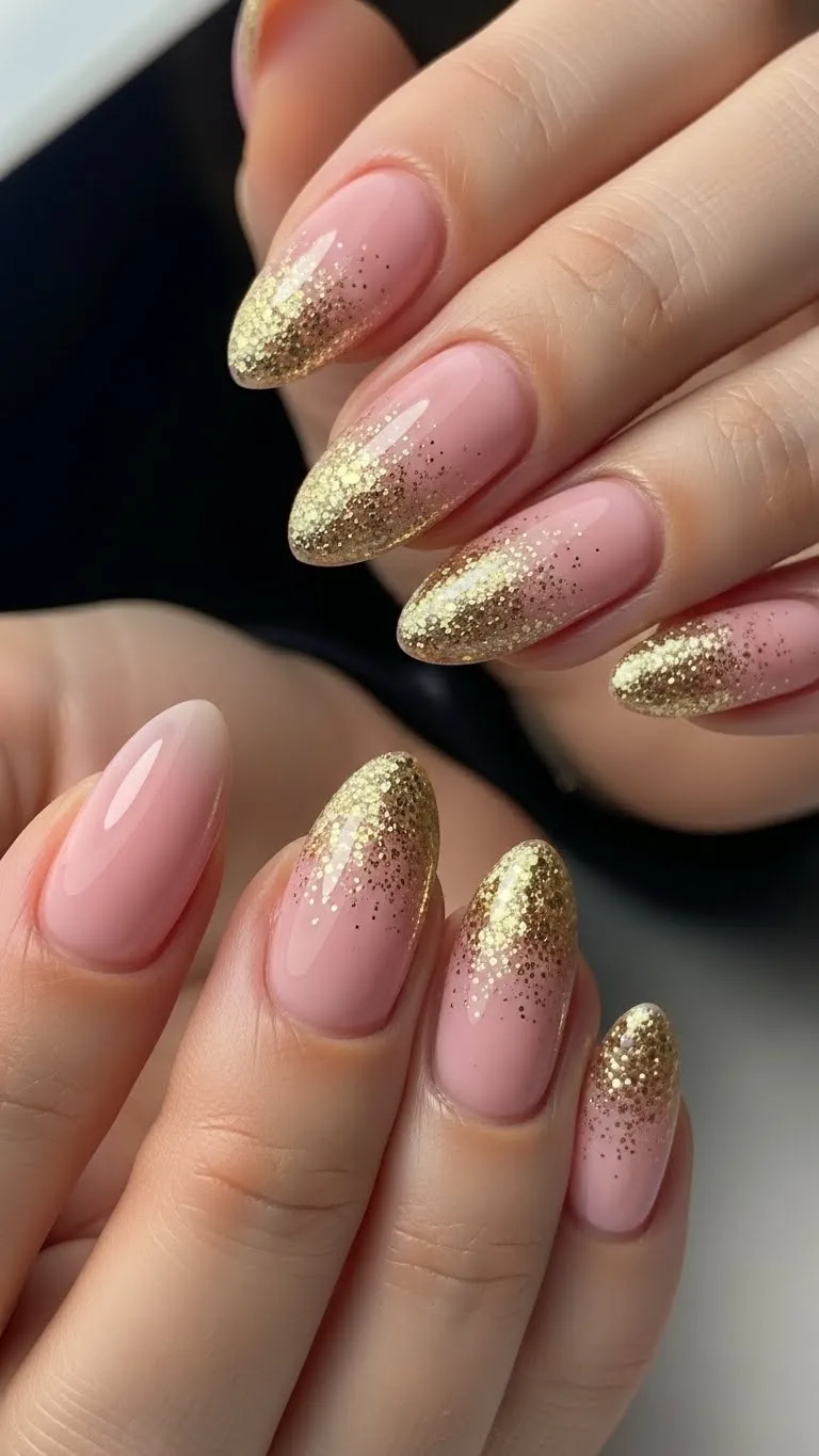 Pastel pink nails with gold glitter accents add subtle sparkle. Apply glitter lightly for a soft gradient. This is simple to DIY and uses minimal glitter, making it budget-friendly. Works well for romantic dinners or evening dates, giving nails a fun yet classy vibe.