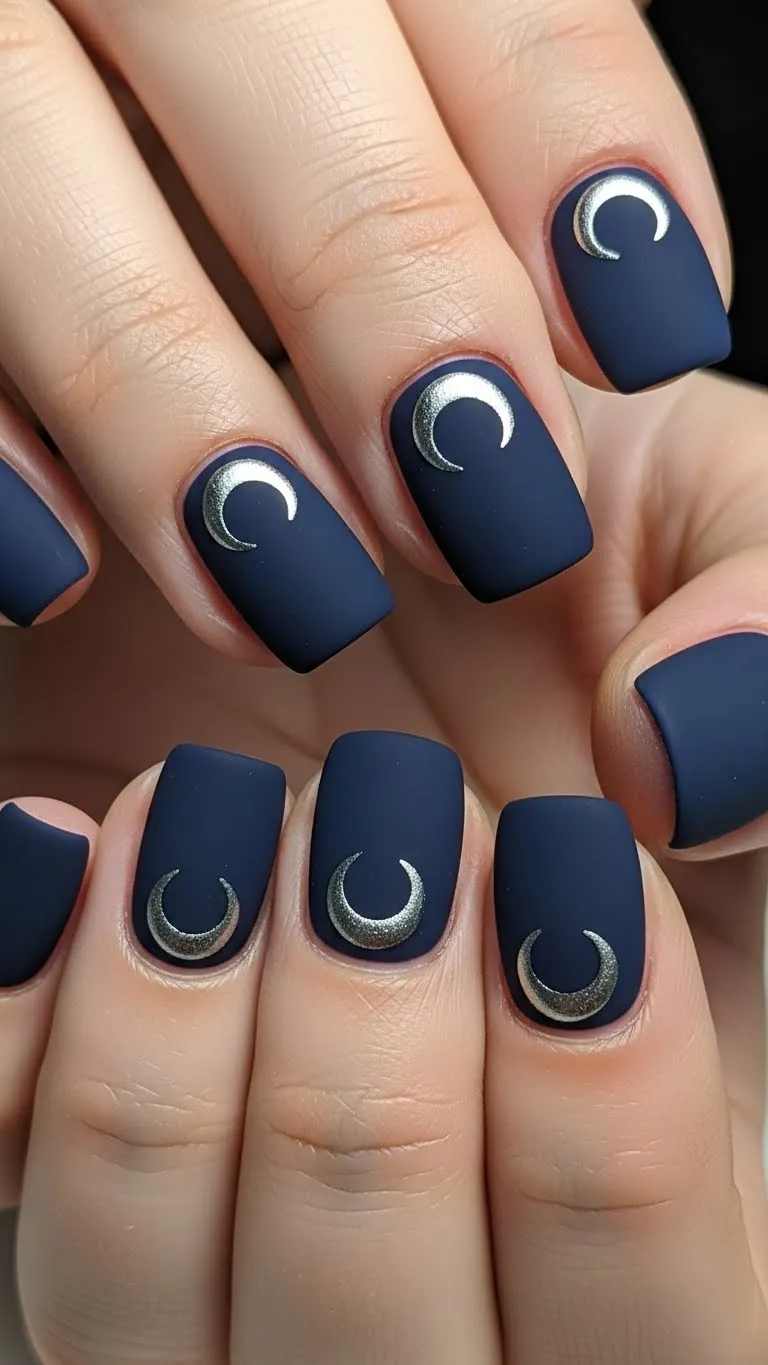 Dark matte nails with a small crescent moon create subtle drama. Use navy or deep plum matte polish, and add tiny moons with a white pen or polish. It’s an affordable twist on classic dark nails. Matte finishes are low-maintenance, perfect for longer-lasting wear. This design suits evening dates, giving an elegant yet mysterious touch.