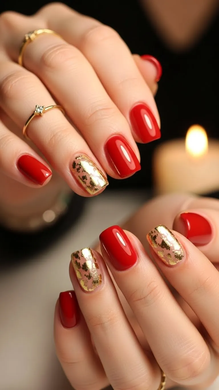 Red and gold are festive and romantic. Paint most nails red and add gold foil accents on one or two nails. Foil sheets or nail stickers make DIY easy and affordable. This combo works well for special occasions or date nights, adding richness without being flashy. Pair with gold jewelry for a cohesive look.