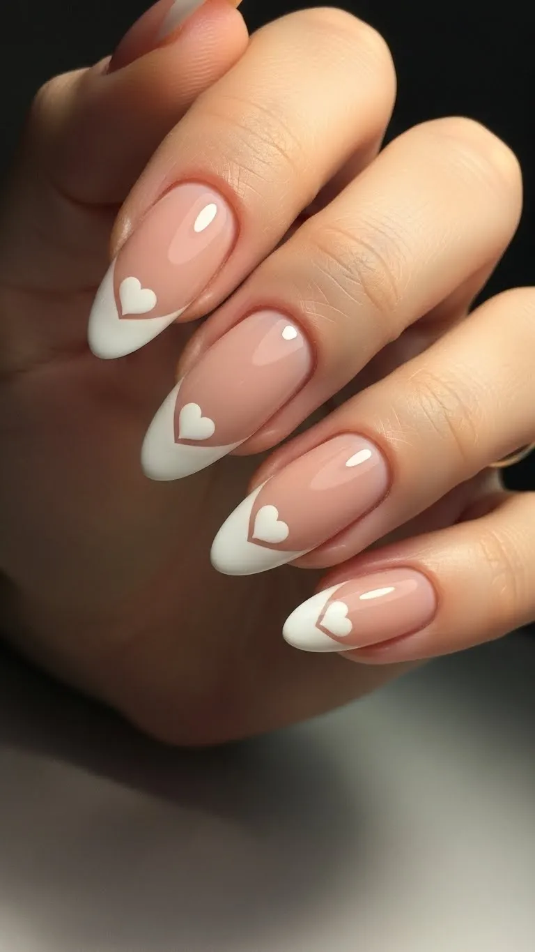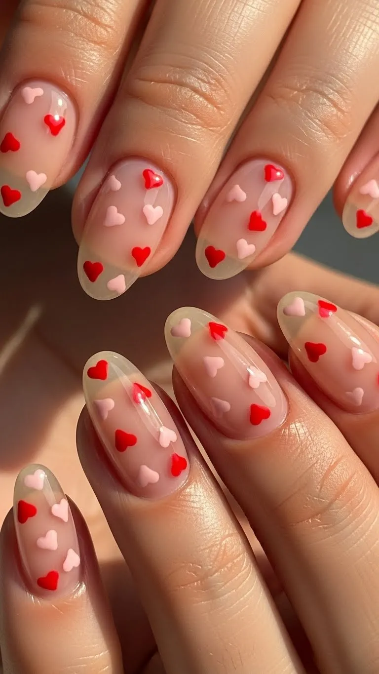Nude nails with tiny heart accents are subtle and sweet. Add one or two hearts per hand using a dotting tool. Budget-friendly tip: Use a toothpick if you don’t have specialized tools. Works for any date night, giving a delicate romantic touch while keeping nails classy.