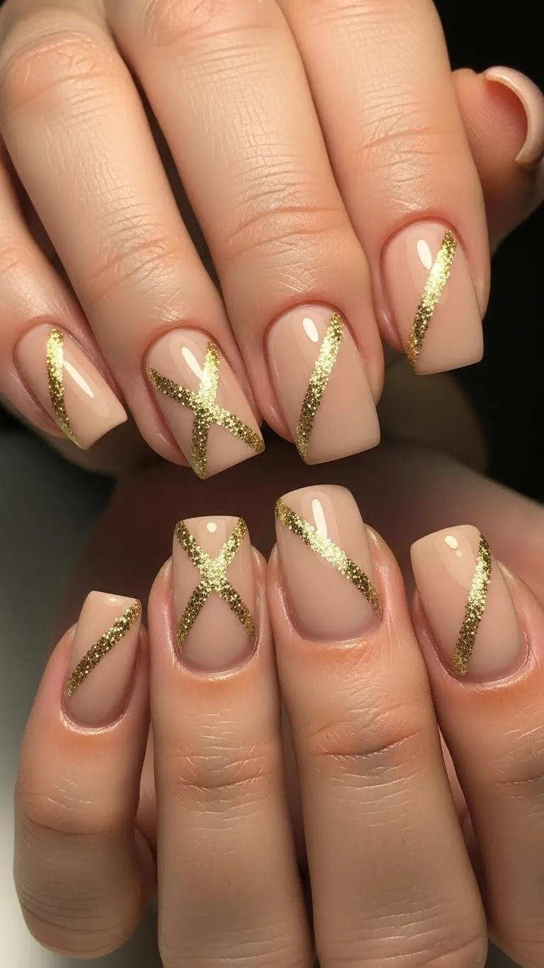 Gold stripes can be done in minutes. Paint your nails a soft nude base, then use nail tape or a thin brush to add sparkling gold lines. This geometric sparkle makes your nails look chic and polished. Budget-friendly tip: Use a single striping brush with gold polish you already own. This design adds elegance while staying playful. It’s perfect for pairing with little black dresses or casual outfits, giving your nails a refined yet fun statement.
