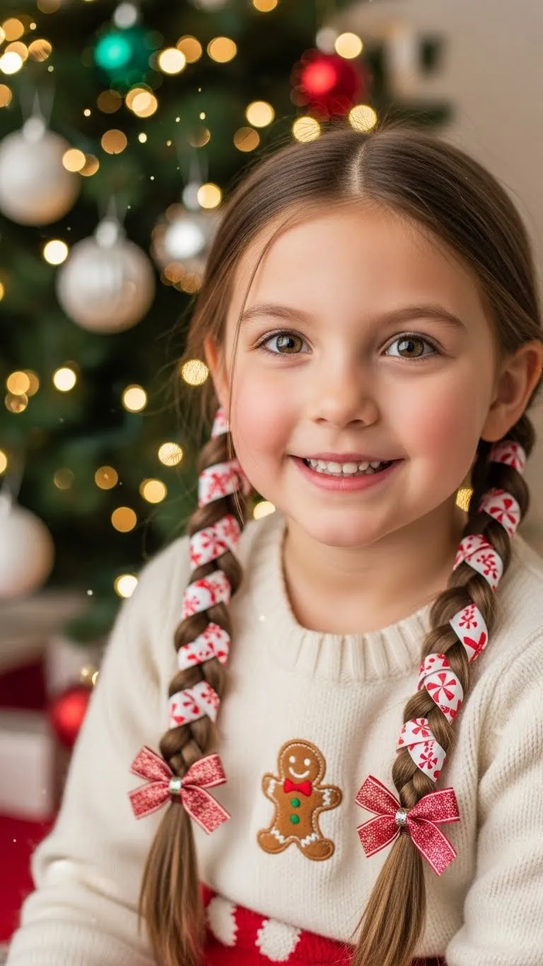 Candy cane braids are a festive and playful hairstyle. Start by creating two basic braids. Wrap thin red and white ribbons around each braid in a spiral pattern. The effect looks just like candy canes! Kids can help by holding the ribbon or picking colors, making it a fun DIY activity. Use hair ties you already have and sprinkle tiny glitter clips for extra sparkle. This style works on most hair lengths and keeps hair neat for parties, school events, or photos.