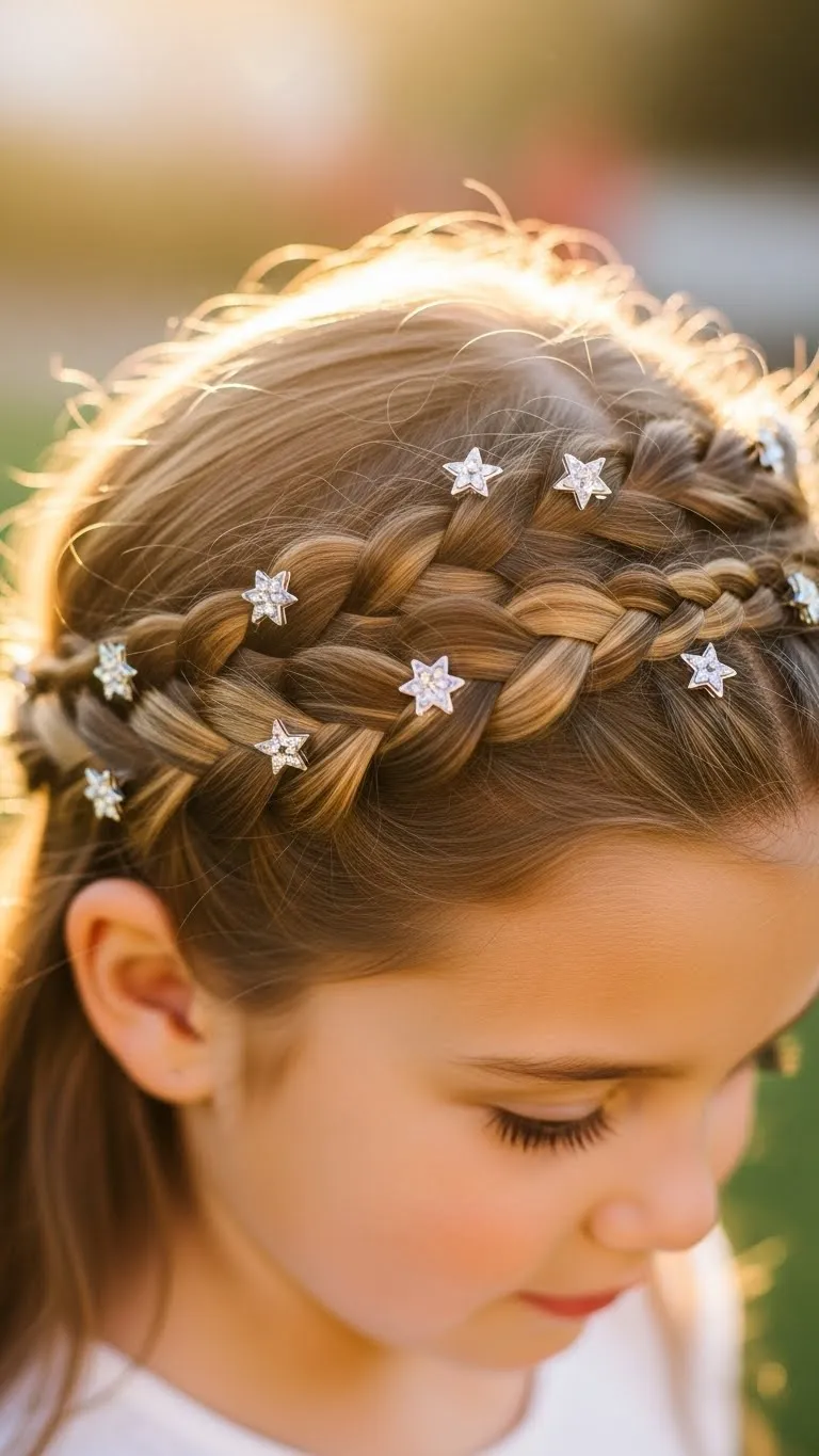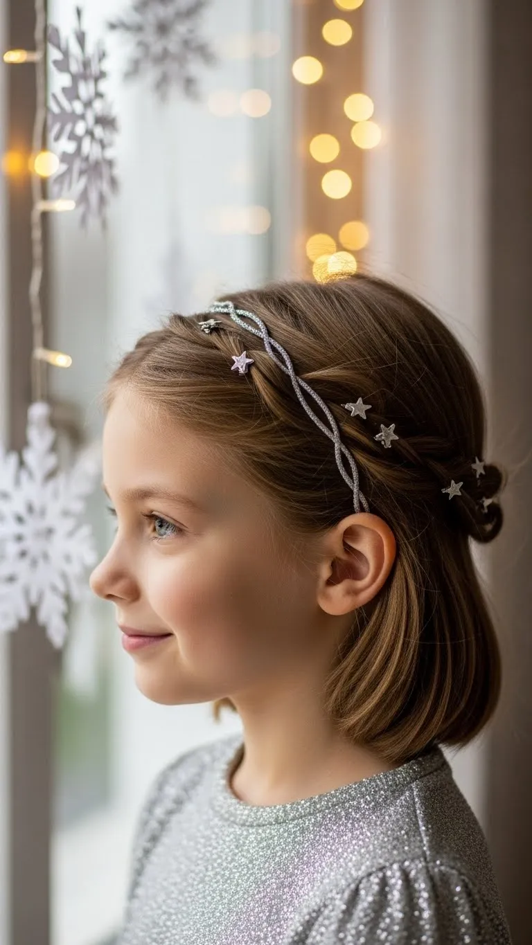Create a braid crown along the hairline and add star clips for a festive touch. Works best on medium-length hair. Kids feel like holiday royalty while keeping hair neat. Minimal supplies needed—clips and hair ties. Let children choose clip colors and placement for DIY fun. Perfect for photos or cozy family gatherings.
