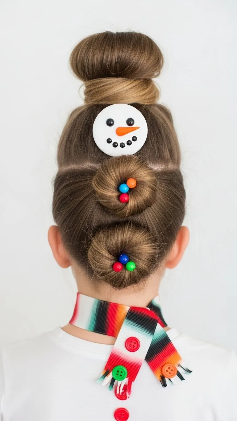 Create a snowman effect with stacked buns. Form three buns, largest to smallest, top to bottom. Decorate with beads for buttons and a ribbon scarf. Works best on medium to long hair. Kids enjoy helping with decoration, making it interactive. Quick, playful, and perfect for school events or family photos. Use hair ties and ribbons from home for a budget-friendly look.