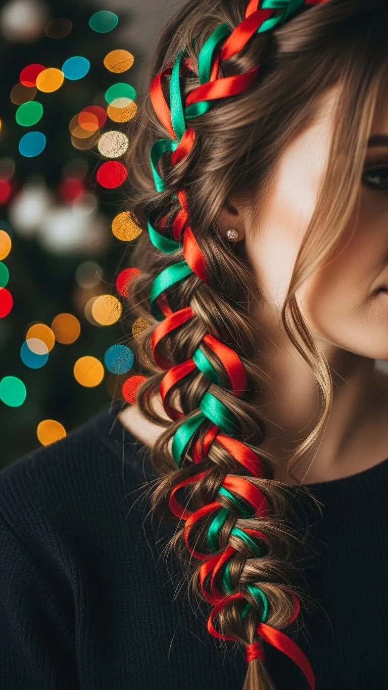 Wrap a braid with festive ribbons for a simple holiday twist. Braid a small section and weave in red and green ribbons. Works on medium-length hair. Kids can help with the ribbon placement for a DIY touch. Affordable, using leftover craft ribbons. Keeps hair neat while adding a festive pop. Quick, playful, and charming for school or family events.