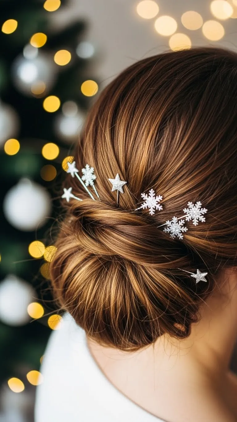 Pull a small hair section to the side, twist, and secure with glitter pins. Quick, subtle, and festive. Works on short or long hair. Kids enjoy choosing glitter pins. Affordable and easy. Perfect for school or family photos, giving a delicate holiday sparkle without fuss.