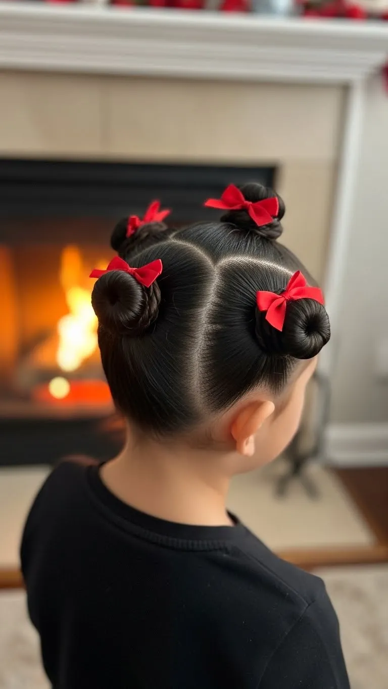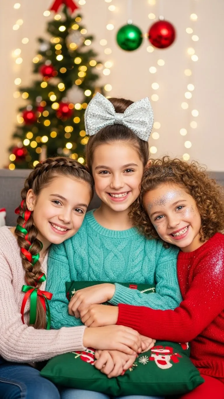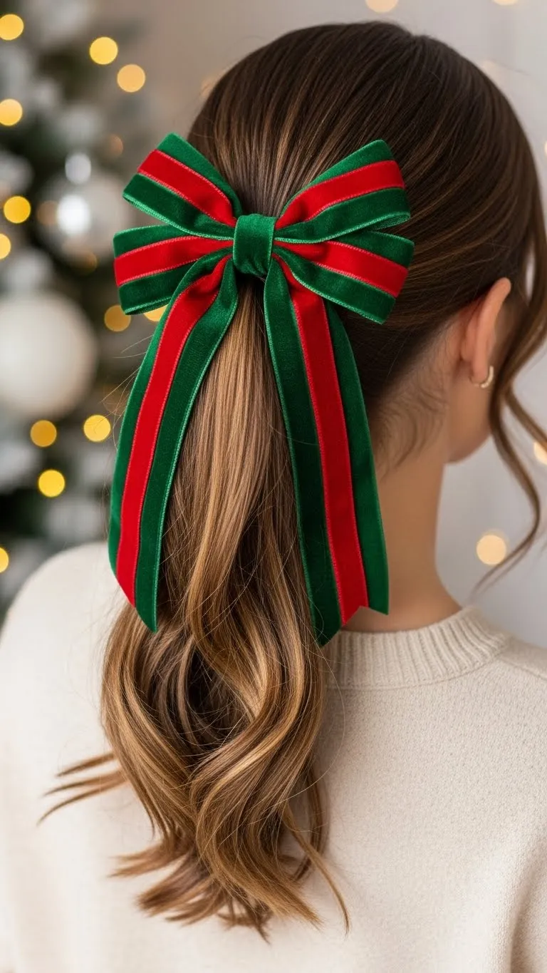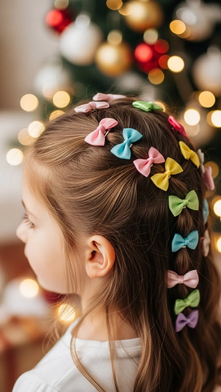 Place multiple small bows throughout hair for a playful holiday look. Works on most hair lengths. Kids can pick colors and clip placement. Affordable using leftover ribbon or small bows. Keeps hair neat and cheerful. Great for casual events, school, or family photos.