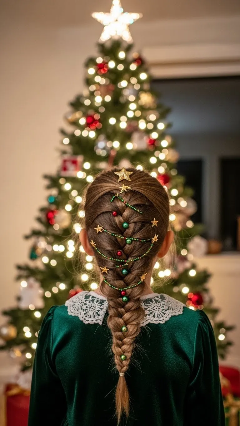 Braid hair into a triangle resembling a Christmas tree. Secure with small beads or star clips. Medium-length hair works best. Kids enjoy adding decorations themselves. Fun, interactive, and festive. Great for school parties, family gatherings, or holiday photos. Quick and budget-friendly.