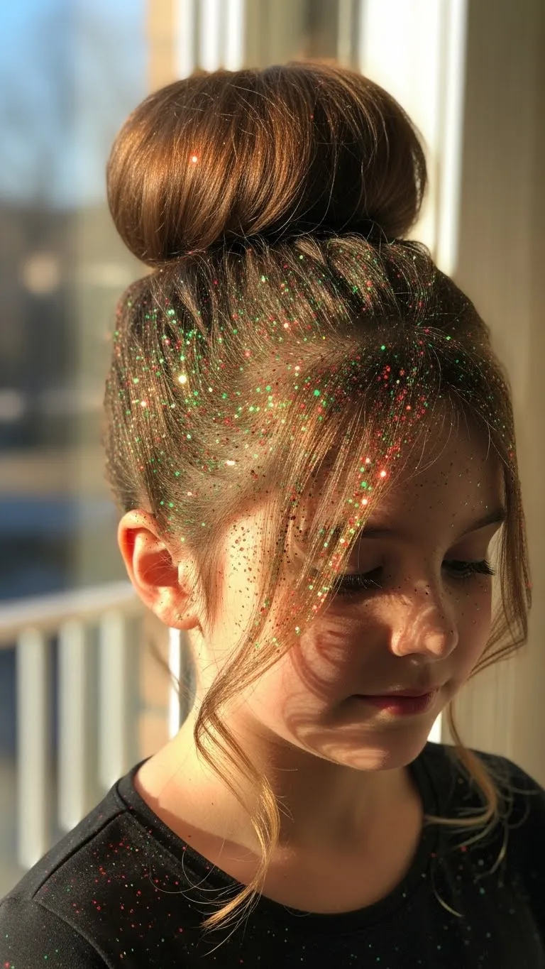 A glittery top knot is perfect for a quick festive style. Pull hair into a high bun and secure with a simple hair tie. Lightly spray with hairspray and add fine glitter for a sparkling effect. Kids love watching the glitter shine. This works on medium or short hair and keeps hair off the face during activities. For a budget-friendly twist, use leftover craft glitter and a small bow at the base for charm. Quick, festive, and fun!