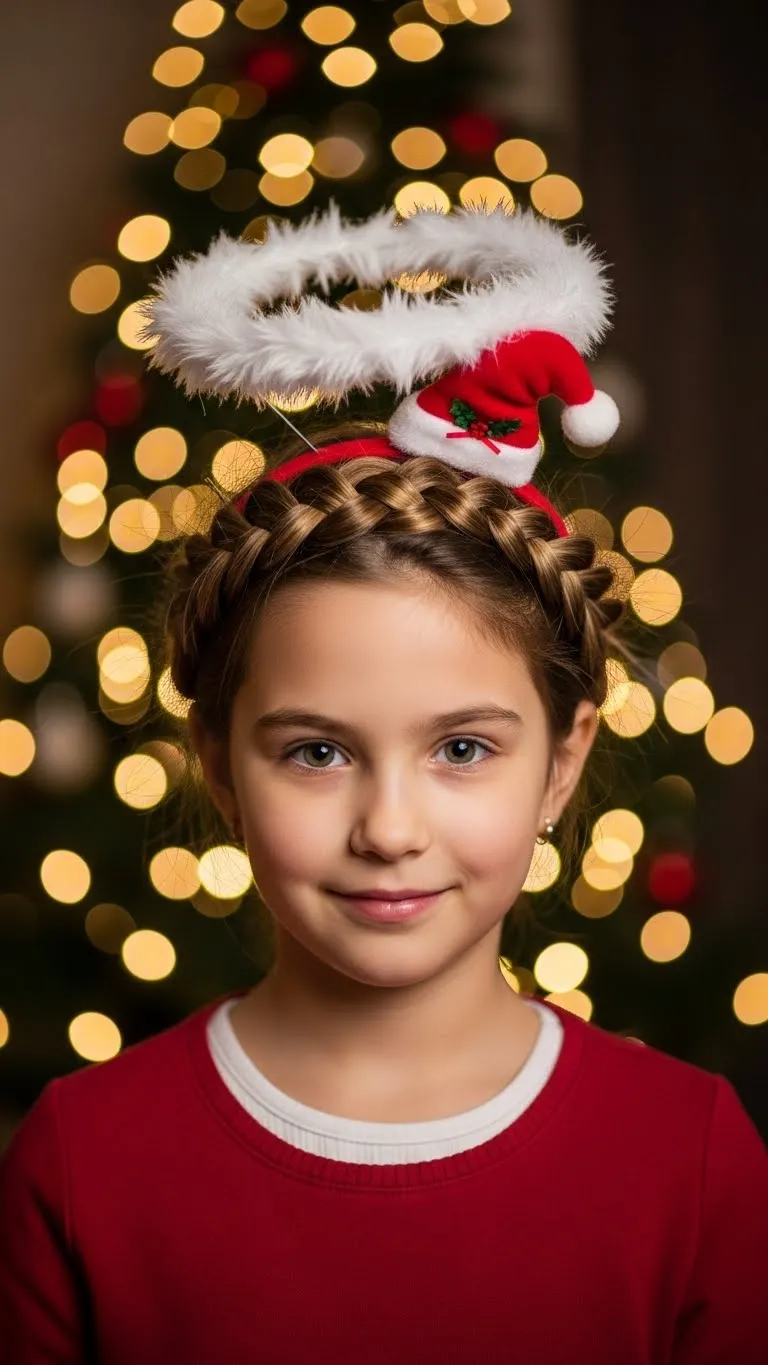 Pair a braid with a Santa-themed headband for instant holiday charm. Create a simple braid along the hairline and tuck the end under the headband. It keeps hair tidy and is playful for school or family events. Kids who dislike hair on their face love this style. Affordable festive headbands from craft stores work perfectly. Let children help place the headband for a hands-on, fun experience.