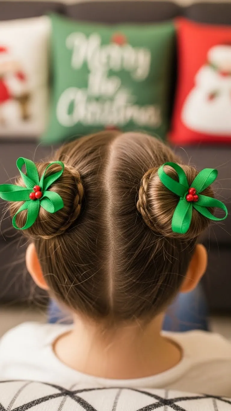 Twisted holly buns are creative and festive. Divide hair into two sections, twist each into a bun, and secure with hair ties. Decorate with tiny red beads as berries and green ribbon loops for leaves. It’s ideal for medium to long hair. Kids love adding decorations themselves. This style takes under 15 minutes and is perfect for parties or family photos. Simple hair ties and craft ribbons keep it budget-friendly and cheerful.