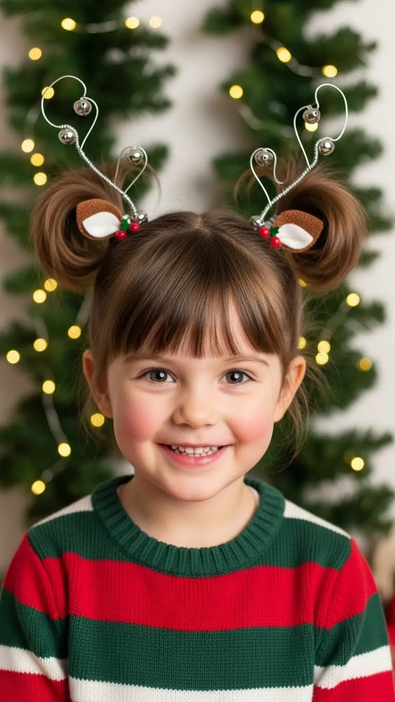 Reindeer antler pigtails are playful and interactive. Make two high pigtails and wrap bendable wire around each to form antlers. Add jingle bells or ribbons for decoration. Kids enjoy moving their “antlers” while wearing this fun style. Works on most hair types. Use craft wire and leftover holiday ribbon for a budget-friendly DIY look. Ideal for school events, parties, or festive photos.