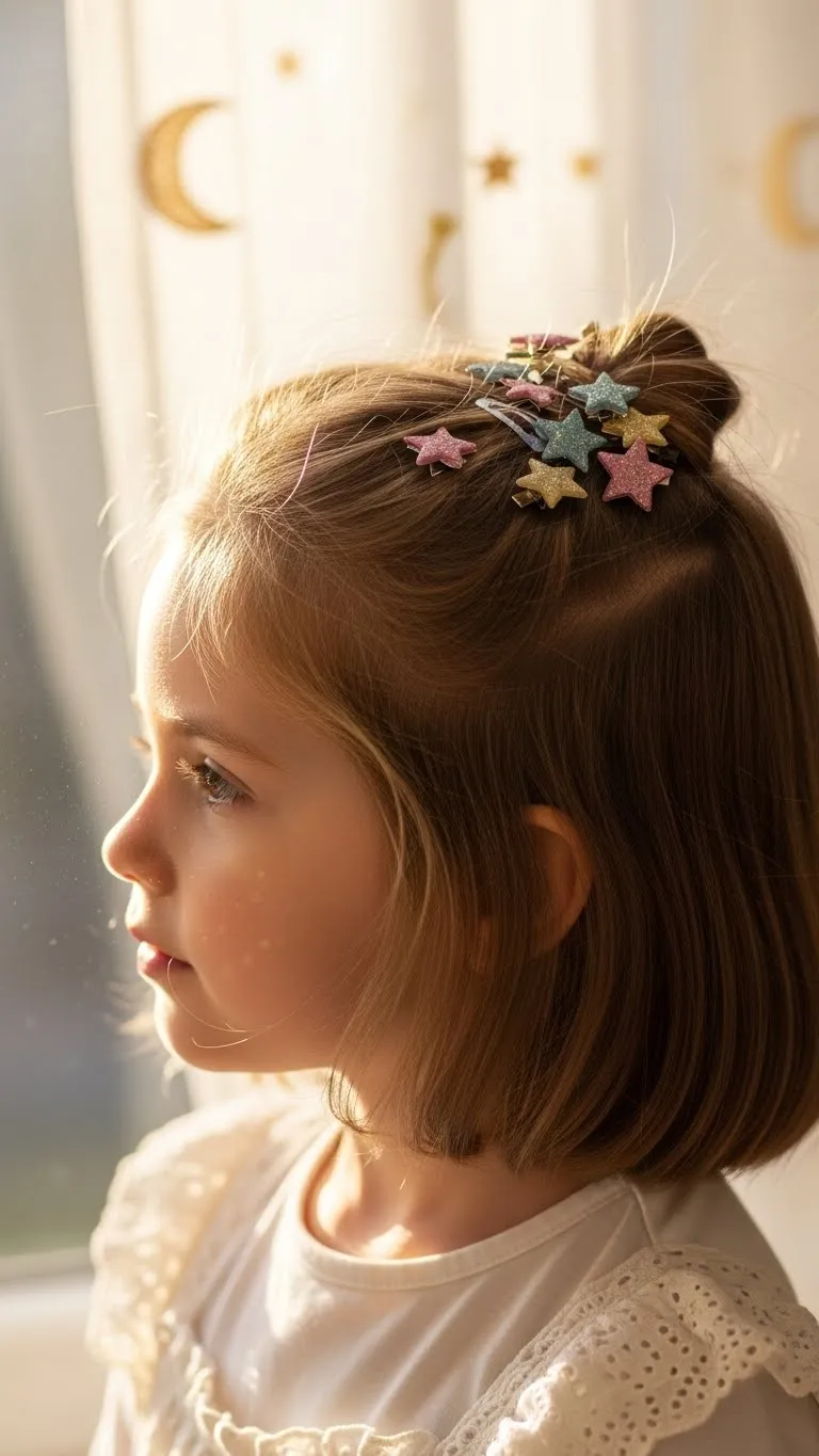 Half-up hairstyles are simple and festive. Pull the top half of hair back and secure it with star-shaped clips. Kids enjoy picking their favorite clips, making it fun and personal. Works for medium-length hair and keeps hair out of the face. Add a little hairspray for hold. Quick, playful, and perfect for school events or family gatherings, this style adds a subtle holiday touch.