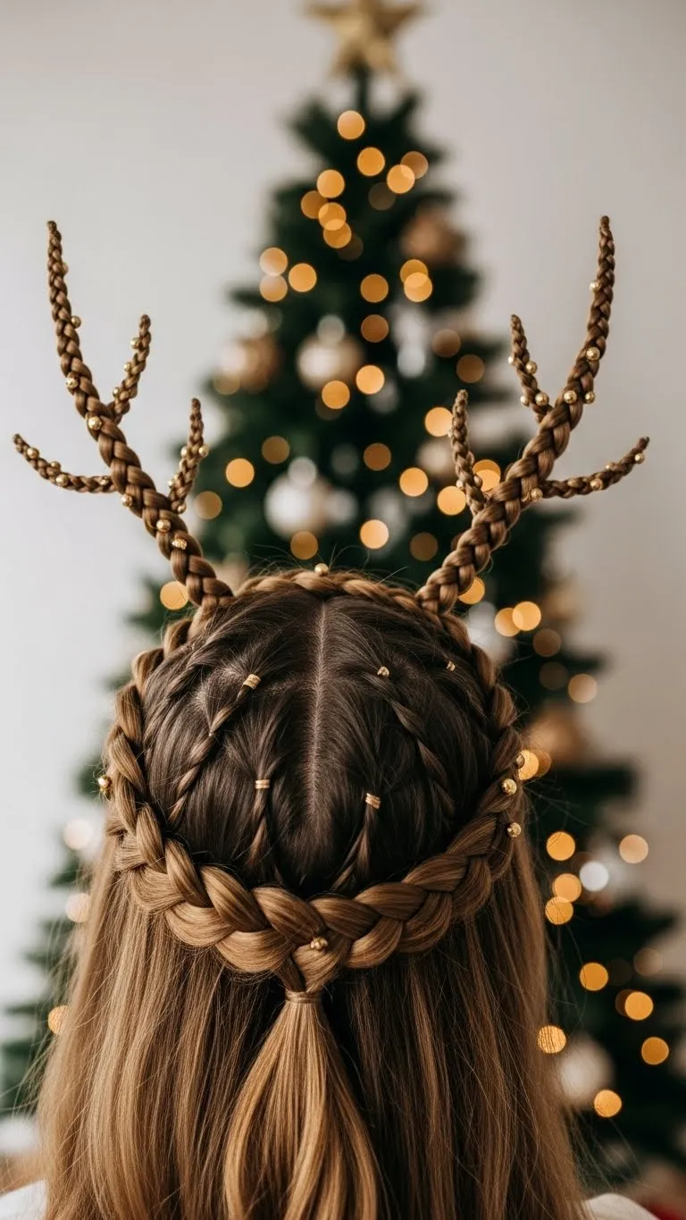 Transform two braids into playful reindeer antlers. Braid two sections of hair, then wrap and pin upward to mimic antlers. Add golden beads or tiny bells for charm. Works best with medium to long hair. DIY tip: Use leftover ribbon or craft beads for decorations. This whimsical style is perfect for holiday school events, themed parties, or casual family photos. It’s playful, festive, and bound to get compliments without being complicated.
