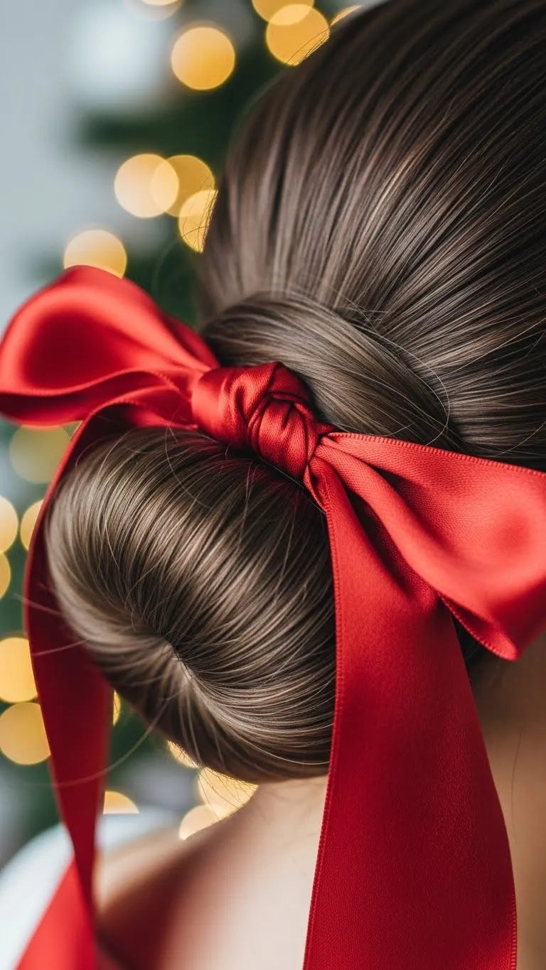 A classic bun tied with a red ribbon is timeless. Sweep hair into a low bun, then tie a festive ribbon around it. Works for all hair lengths with minor adjustments. Budget tip: Use inexpensive satin ribbons from craft stores. Suitable for formal dinners or casual outings. This style is simple yet elegant, keeps hair in place, and the ribbon adds festive color effortlessly. It pairs well with holiday dresses or casual sweaters alike.