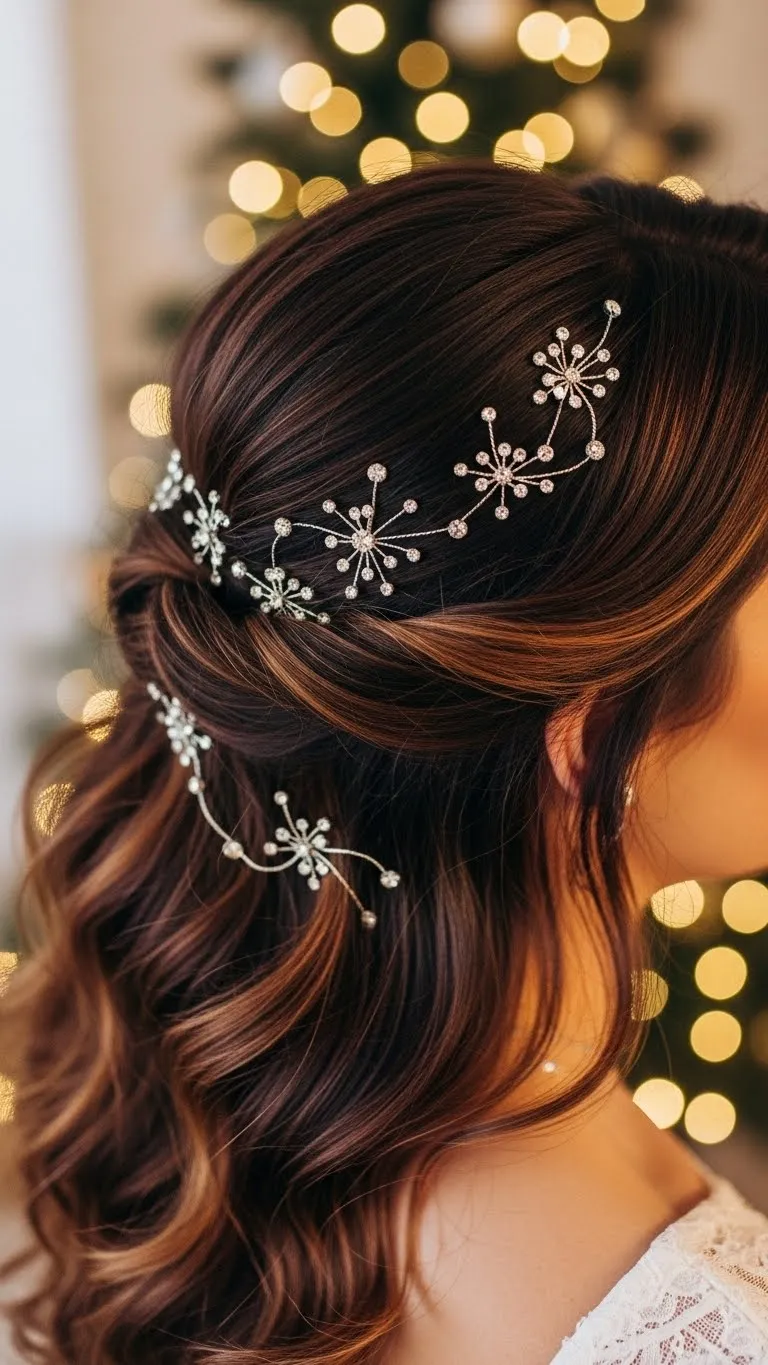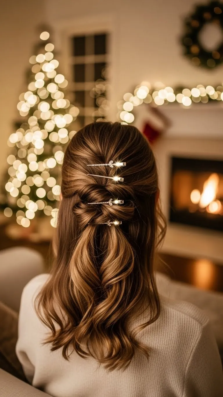 A half-up twist is versatile and quick. Take small front sections, twist them, and pin at the back. Add sparkling clips for festive flair. Works for medium-length hair. Budget tip: Glitter clips are affordable and easy to use. Ideal for casual gatherings, photos, or Zoom parties. Keeps hair out of your face while showing off loose waves underneath. Simple, quick, and festive with minimal effort.