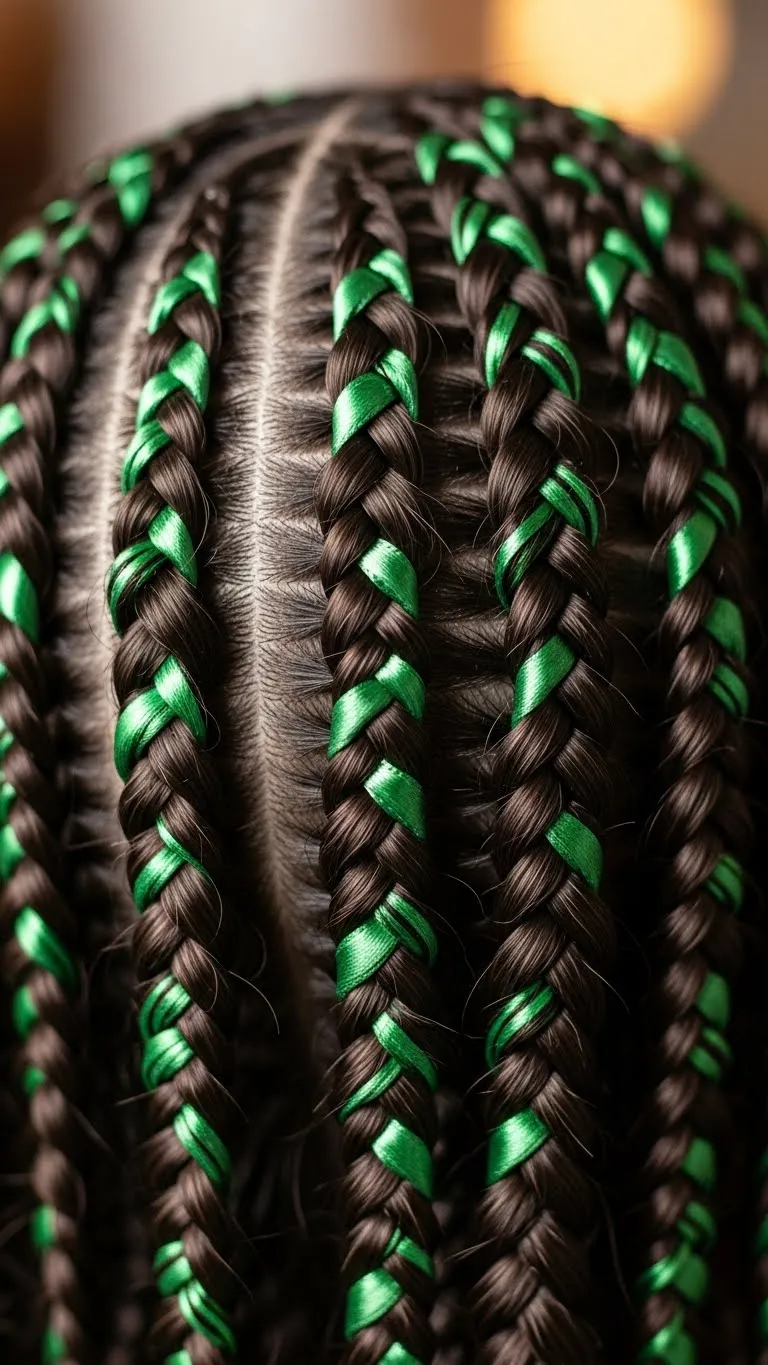 Weave thin green ribbons into braids to mimic pine needles. Braid hair normally, then interlace ribbon throughout. Works for medium to long hair. DIY tip: Use leftover gift wrap or ribbon. Perfect for themed parties or Christmas photos. It’s playful yet neat, allowing hair to stay controlled while adding a seasonal touch. Finish with a light hairspray to keep ribbons in place.