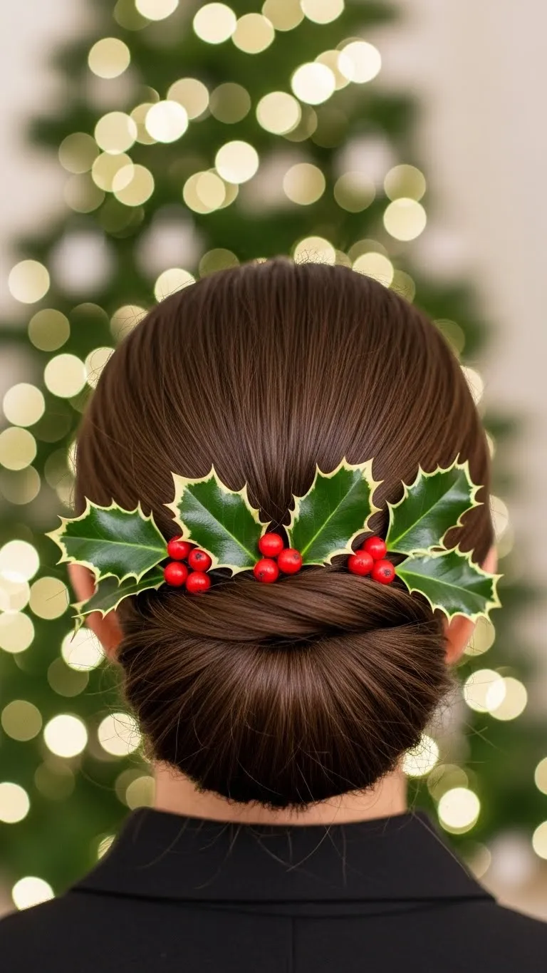 The low chignon is elegant for formal events. Twist hair into a bun at the nape, secure with pins, and add small holly accessories. Works for medium to long hair. DIY tips: Make tiny holly leaves from craft paper. Ideal for office parties or formal dinners. Keeps hair controlled while looking chic. Adds a touch of holiday charm without overcomplicating your styling routine.