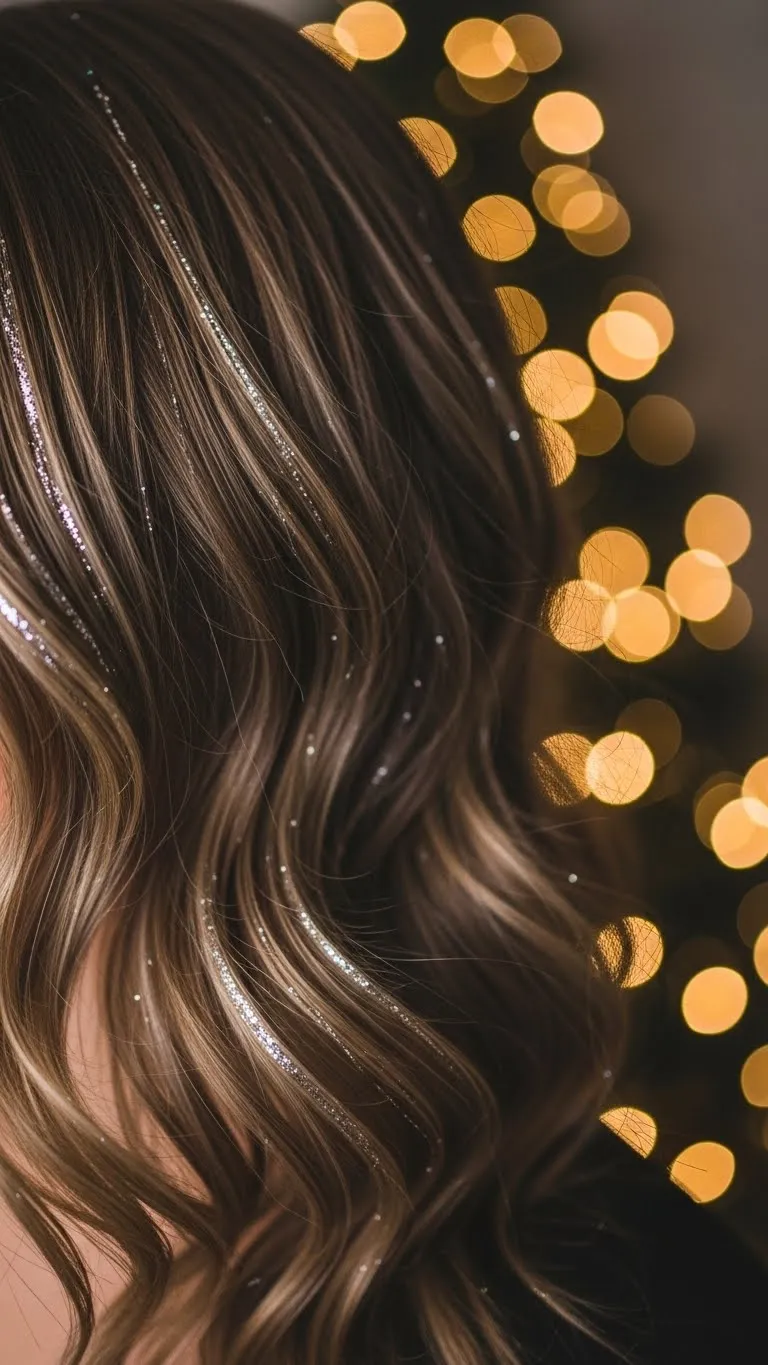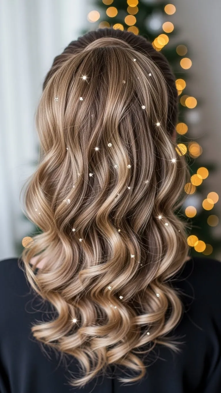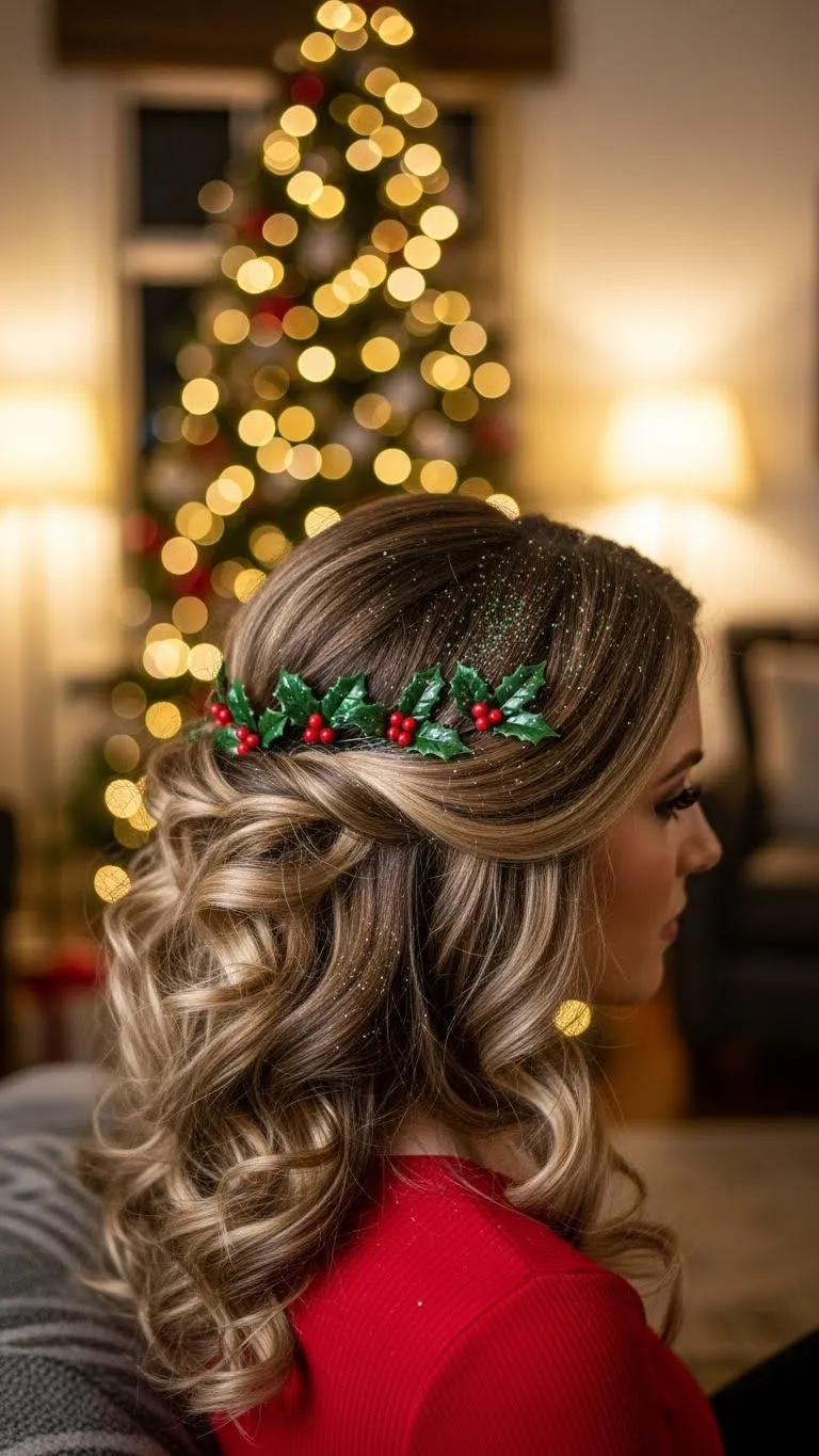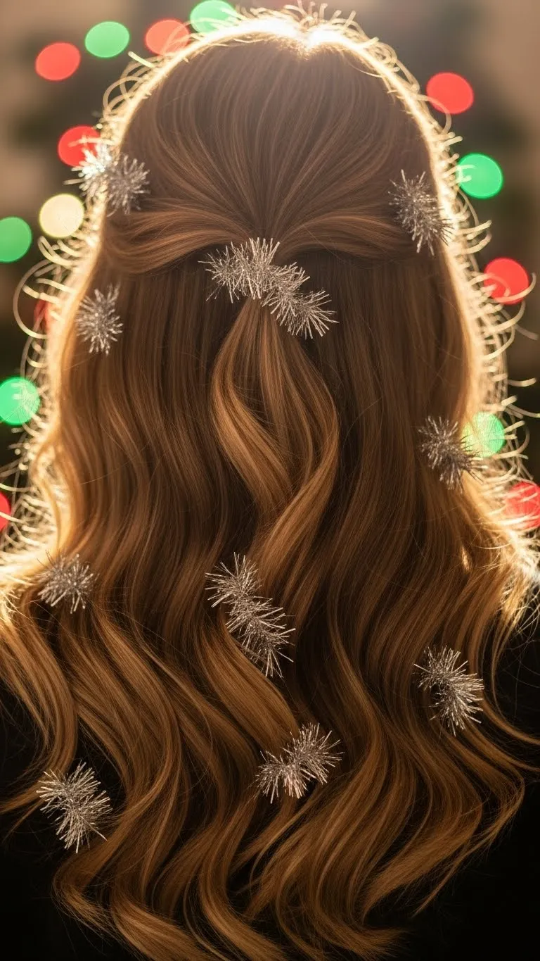 Soft waves paired with tinsel clips create effortless holiday glam. Curl hair loosely, then pin small sections with sparkling tinsel clips. Works for medium to long hair. Affordable tinsel clips are widely available or can be made from craft foil. This look is casual enough for daytime events yet sparkly enough for evening parties. Bonus tip: Alternate colors of tinsel to match outfits. The hairstyle is simple, comfortable, and festive-ready in under 20 minutes.