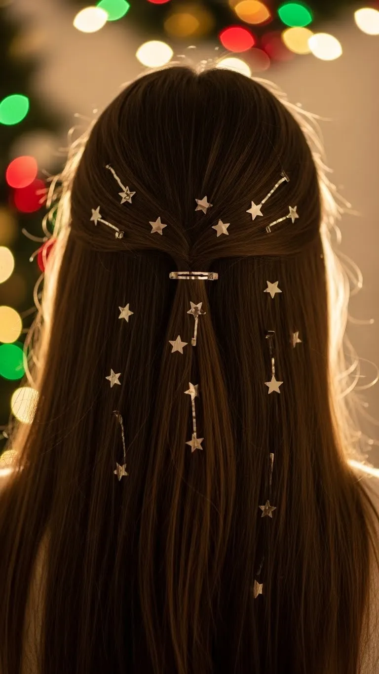 Decorate hair with star-shaped clips for a fun look. Style hair naturally, then pin clips throughout. Works for all lengths. DIY tip: Make paper or foil stars if clips are unavailable. Great for casual gatherings or photos. Easy to create and remove, adding festive sparkle with zero fuss. Can be combined with other styles like half-up twists or loose waves.