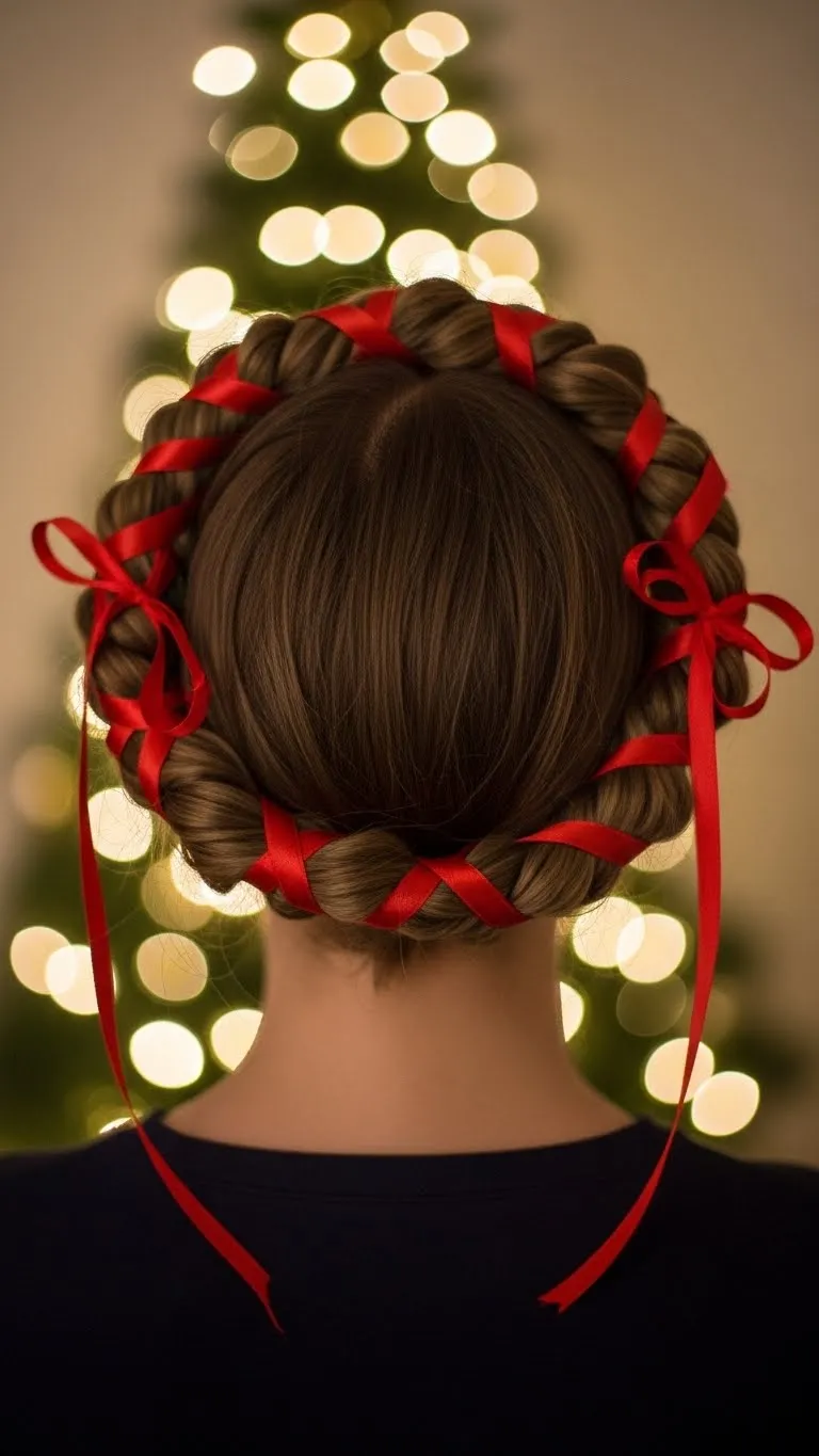 Create a halo effect by twisting hair around the head. Interweave a red ribbon for festive charm. Works best for medium to long hair. DIY tip: Use thin ribbon from wrapping paper. Great for family dinners or photo sessions. Simple, elegant, and festive without needing advanced styling skills. Comfortable to wear for extended periods.