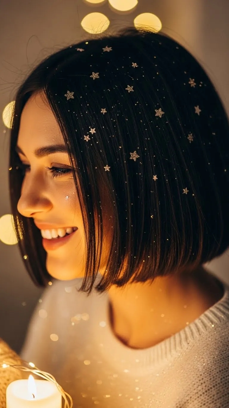 Even short hair can sparkle. Pin small glittery accessories along a bob. Works for short to medium hair. Affordable glitter pins add holiday cheer instantly. Perfect for casual parties or office gatherings. Quick, simple, and playful. Allows short-haired people to join festive styling without extra effort. Minimal styling required and looks instantly cheerful.