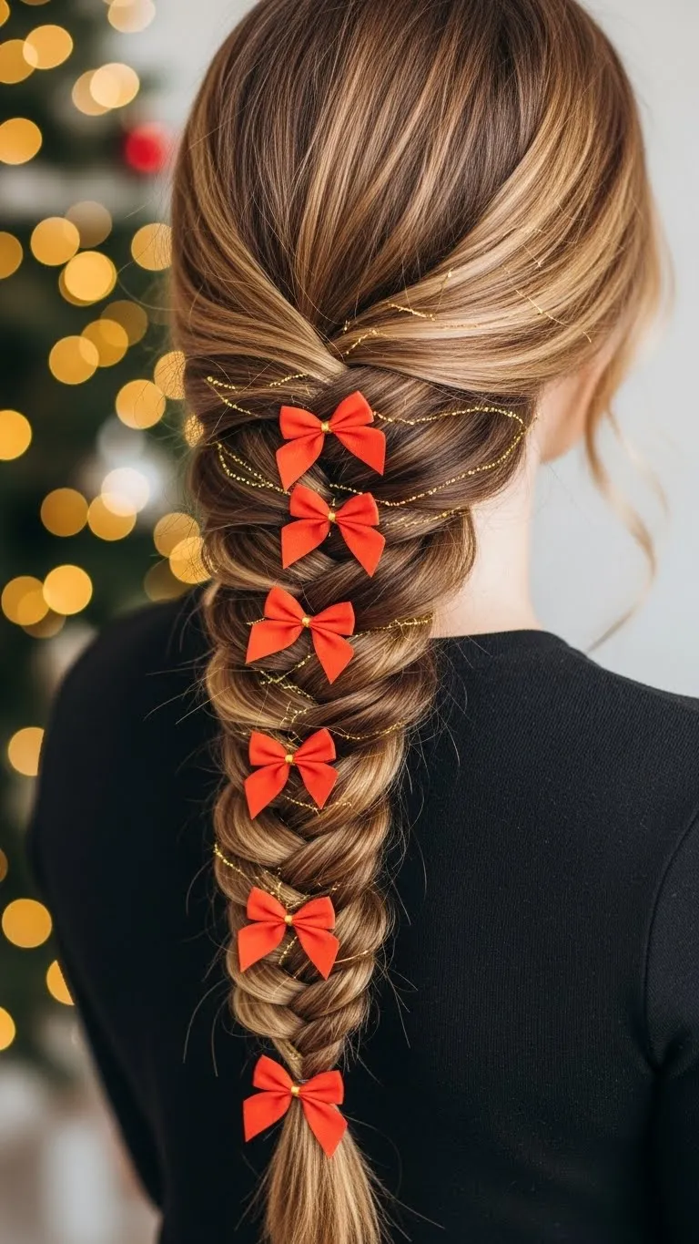 The fishtail braid is a classic style with a festive twist. Divide your hair into two sections, then take small strands from the outside and cross them over to the opposite section. Repeat until the braid reaches the end. Tie with a red ribbon or weave in thin golden tinsel for a holiday feel. This style works for medium and long hair, and it can be adjusted for a loose, messy vibe or a tight, elegant look. For a budget-friendly option, DIY small bows with leftover ribbon. The fishtail braid keeps hair controlled while adding charm, making it perfect for daytime holiday outings.