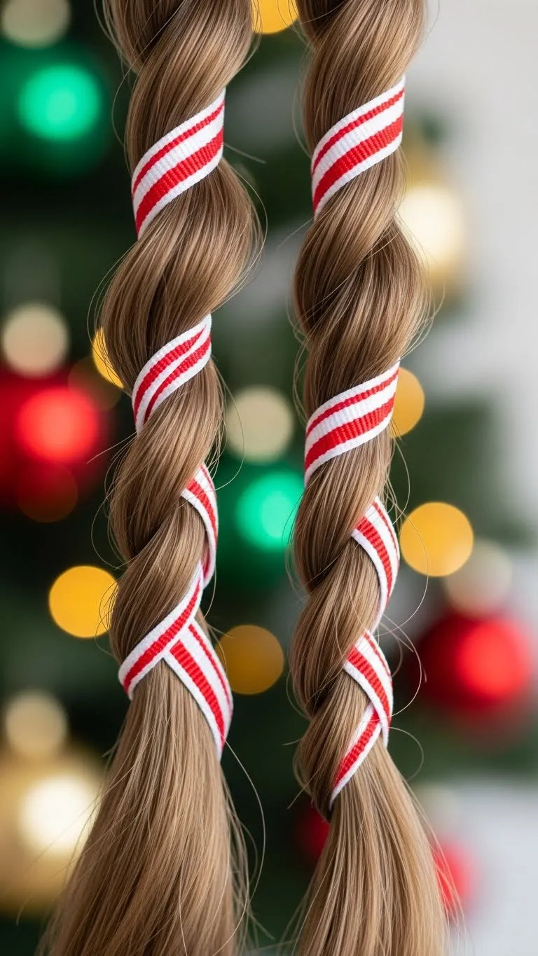 Candy cane twists are fun and youthful. Split your hair into two sections. Twist each section tightly, then wrap a thin red-and-white ribbon around each twist. Secure with small hair elastics. This playful style works for long hair and is perfect for school parties or casual holiday events. DIY ribbons can be found cheaply at craft stores. Keep twists neat or loosen them slightly for a softer, relaxed look. This hairstyle adds instant festive cheer and pairs well with simple makeup.