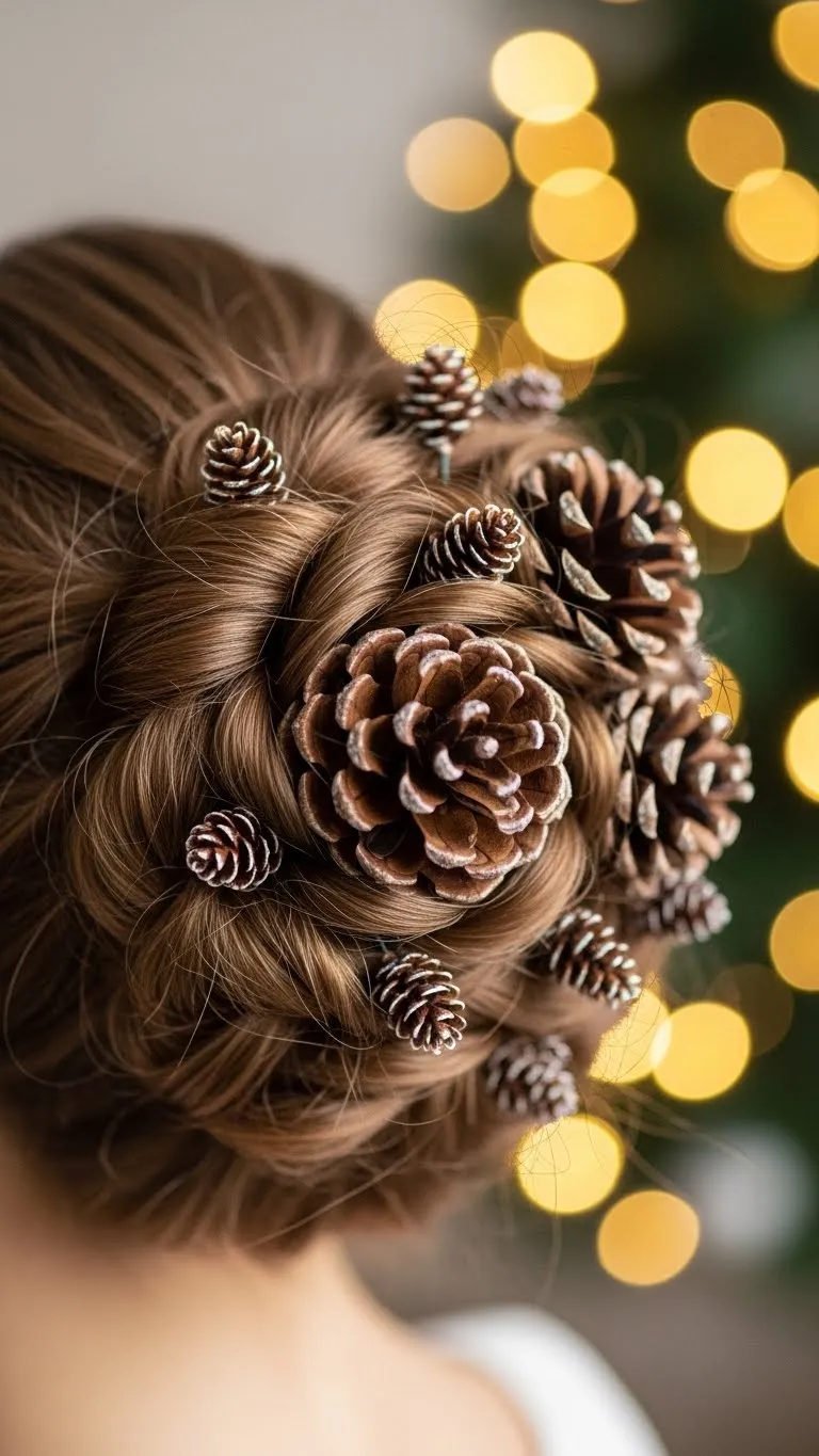 A pinecone updo captures the essence of the season. Curl hair lightly, then pin sections into a layered, overlapping updo resembling a pinecone. Add miniature pinecone hairpins for extra flair. Works best with medium to long hair. This style is ideal for formal parties and family gatherings. For a budget-friendly version, craft tiny pinecones from paper or use small decorative ornaments. Secure with bobby pins and finish with light hairspray. It’s a show-stopping style that makes a statement without needing professional help.