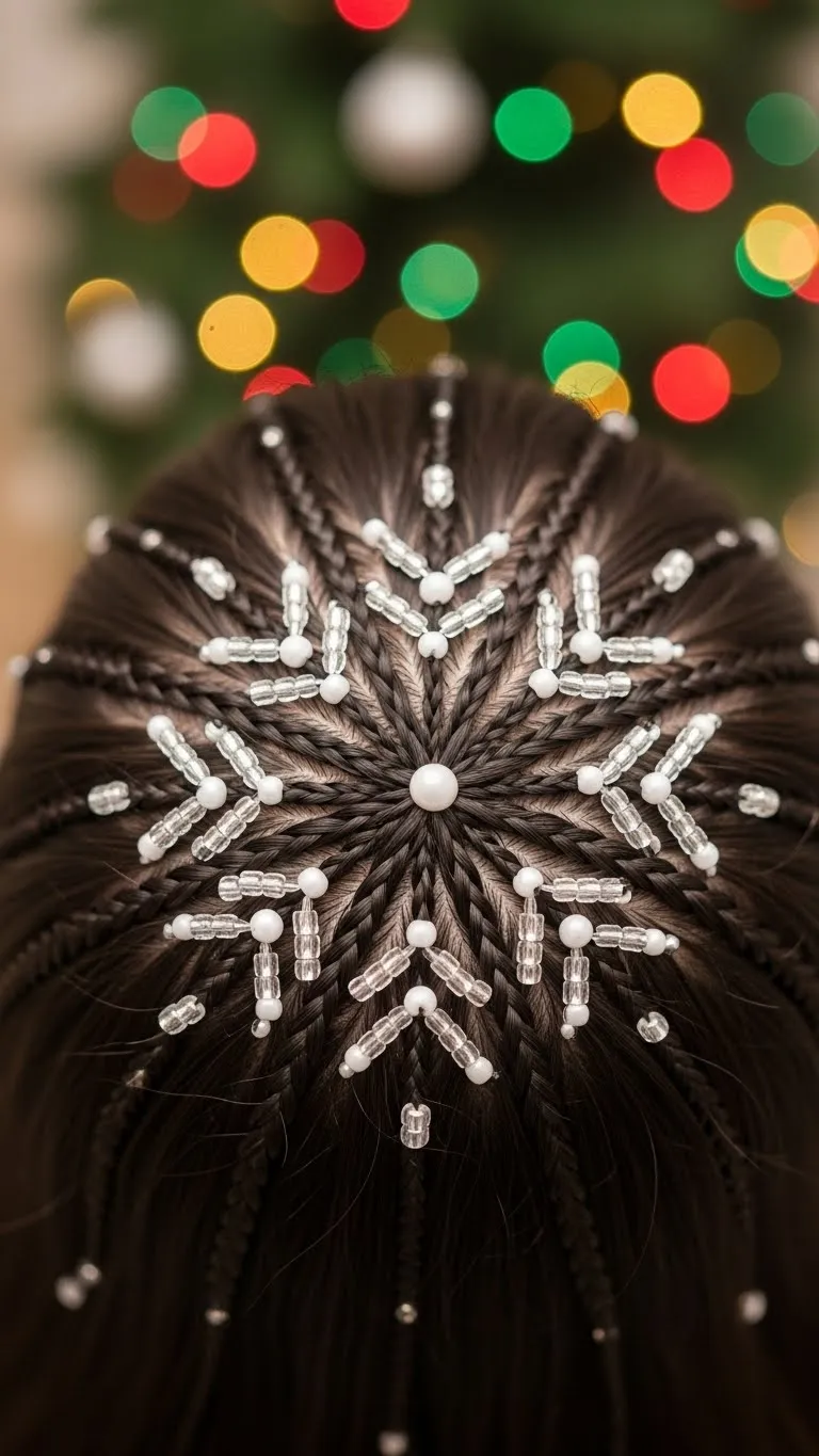 Small braids arranged to mimic snowflakes create a whimsical look. Part hair into several small sections. Braid each section, then pin ends in circular patterns on top of the head. Add tiny white beads or hairpins to mimic snowflakes. Works for medium to long hair. DIY beads can be sourced cheaply at craft stores. Ideal for winter photos or themed parties. This style is creative yet simple, keeping hair secure and showcasing your festive spirit with minimal effort.