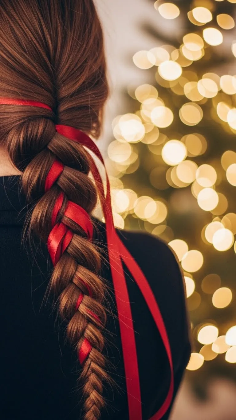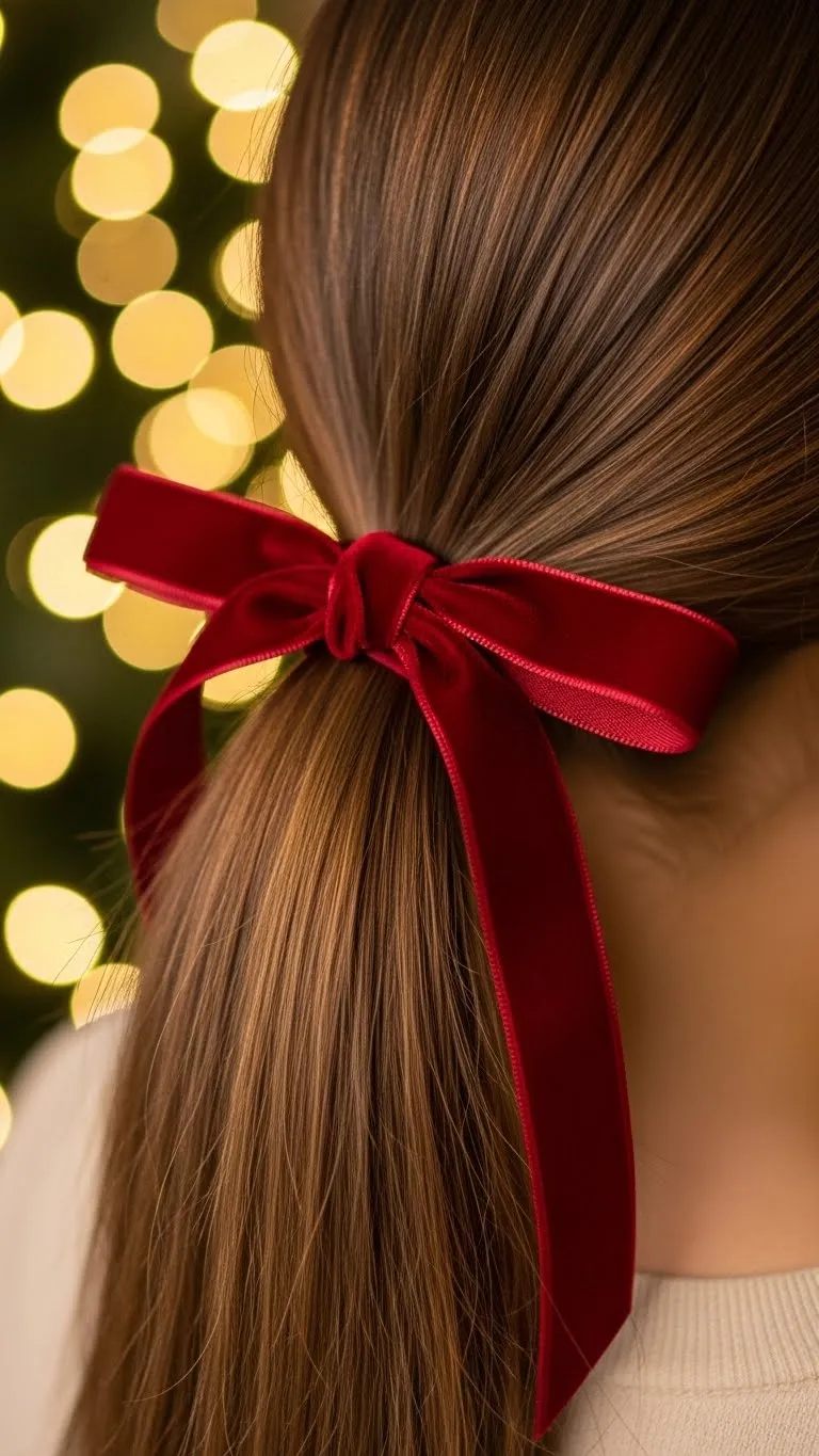 A ribbon ponytail works for any hair length that reaches beyond the shoulders. Keep it low to make it look clean. Brush your hair back and use a simple elastic. Wrap a small piece of hair around the elastic for a polished finish. Then tie a velvet ribbon on top. Velvet looks rich without costing much. Pick deep red, forest green, or gold. If your hair slips out, add light hairspray. You can also curl the ends for a fuller shape. It’s quick. It’s simple. And it looks styled without much effort. For a cheaper ribbon option, cut a strip from old holiday fabric. It still looks nice in photos.